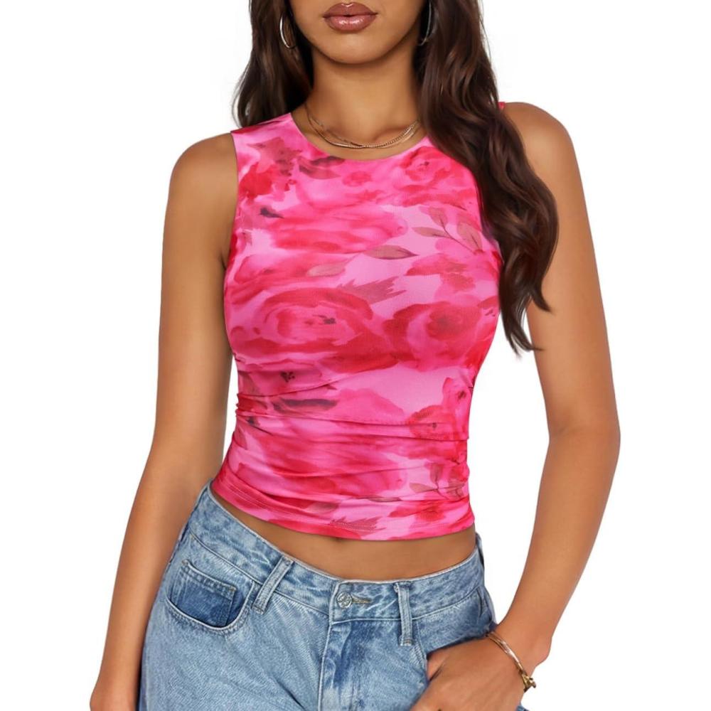 ZESICA Women’s 2026 Summer Sleeveless Floral Tank Tops Mesh Y2K Crop Going Out Outfits Beach Vacation Trendy Clothes(Rose)
