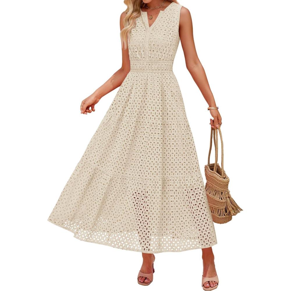 Introducing the ZESICA Sleeveless Eyelet Maxi Dress – this summer dress for women is crafted from lightweight, soft, and skin-friendly fabric that feels comfortable and allows for easy movement. The versatile dress is great for a beach vacation, picnic, coffee date, wedding guest occasion, cocktail party, birthday celebration, or a simple day out. This trendy boho dress features an elegant eyelet embroidered hollow-out design for a touch of bohemian charm, a flattering V-neck, and a comfortable high empire elastic waist that defines your silhouette. The flowing A-line hem, complete with convenient side pockets, creates a effortlessly graceful look. It's a must-have stylish piece for your spring and summer wardrobe.
