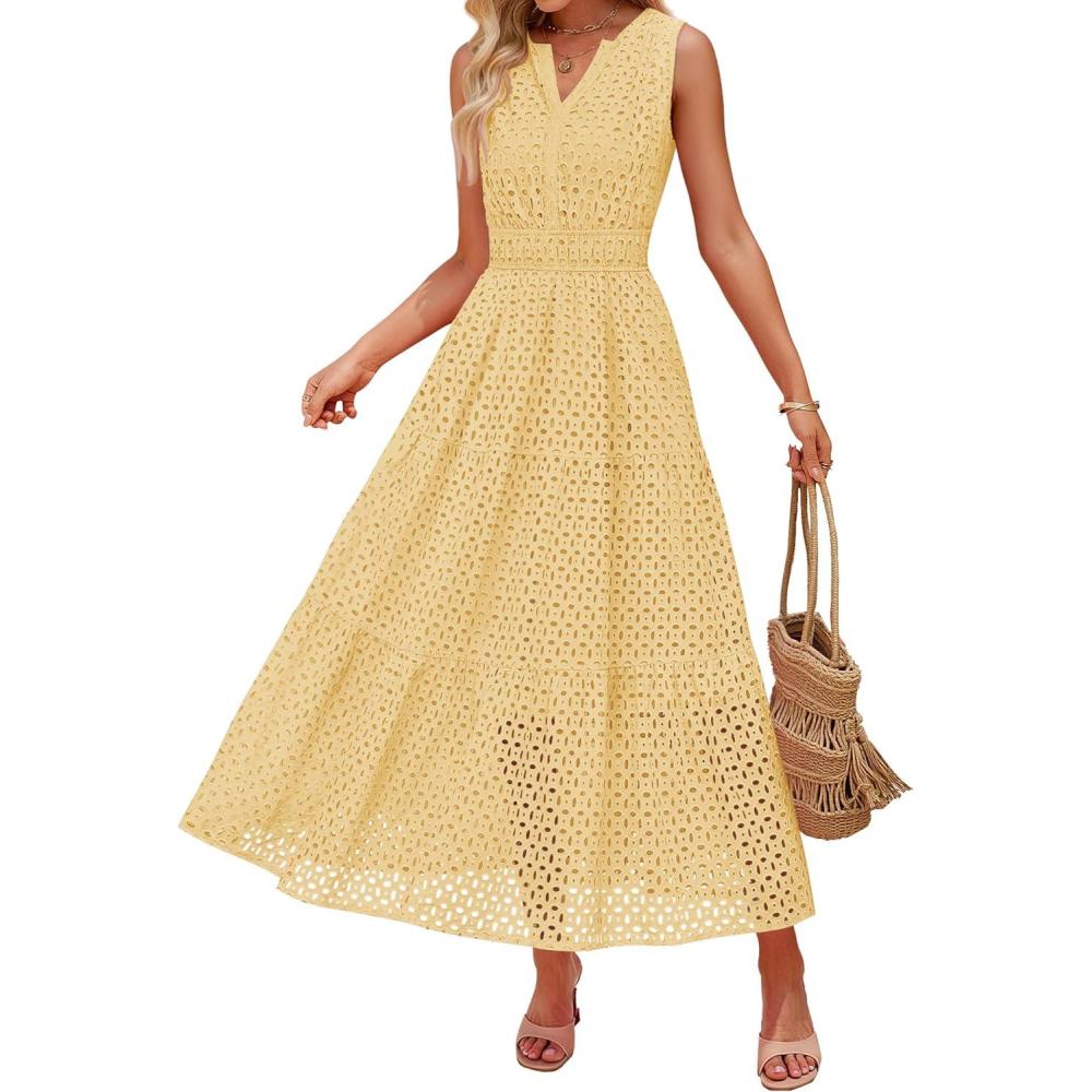 ZESICA Women’s 2026 Summer Sleeveless Maxi Dress Casual V Neck Hollow Out Eyelet A Line Flowy Party Long Dresses(Lightyellow)