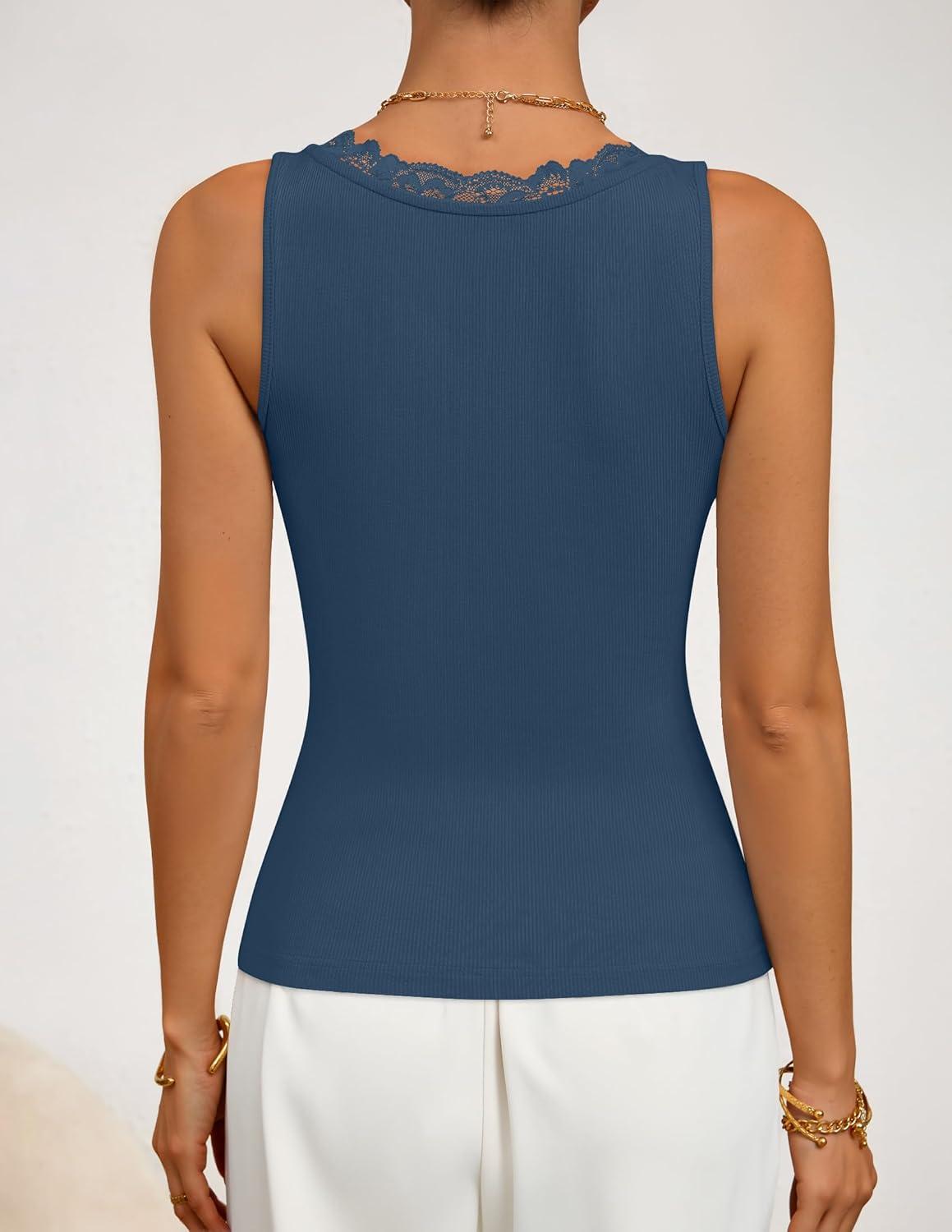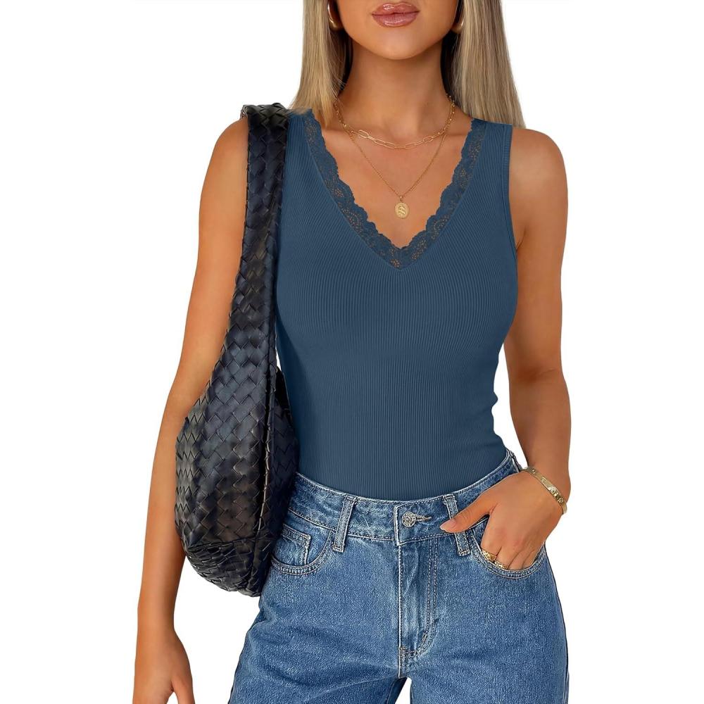 ZESICA Womens 2026 Summer V Neck Tank Tops Spring Sleeveless Lace Trim Ribbed Knit Casual Going Out Cami Shirts(Dustyblue)