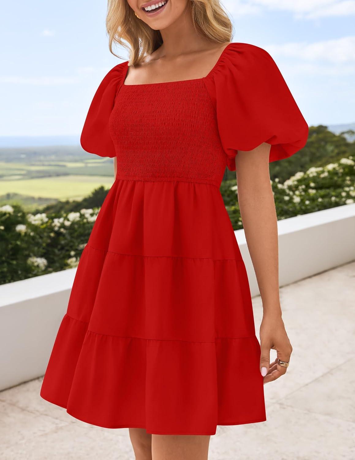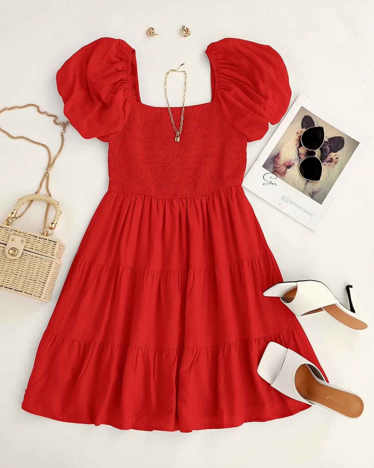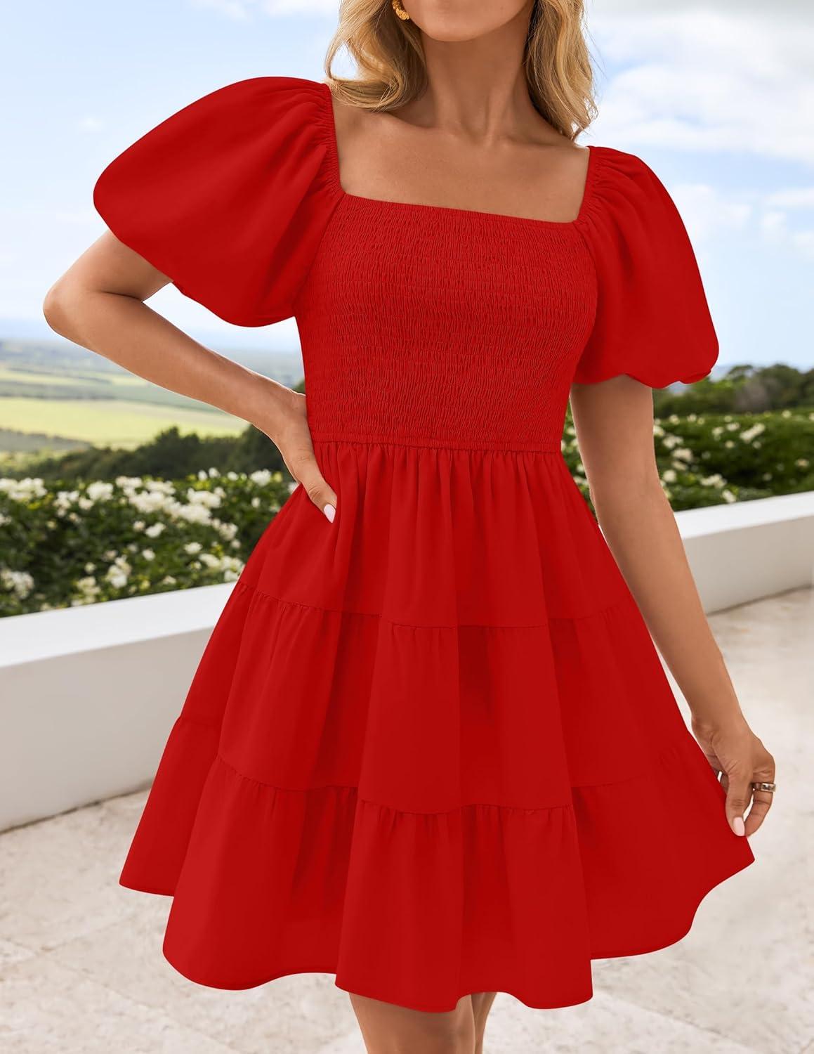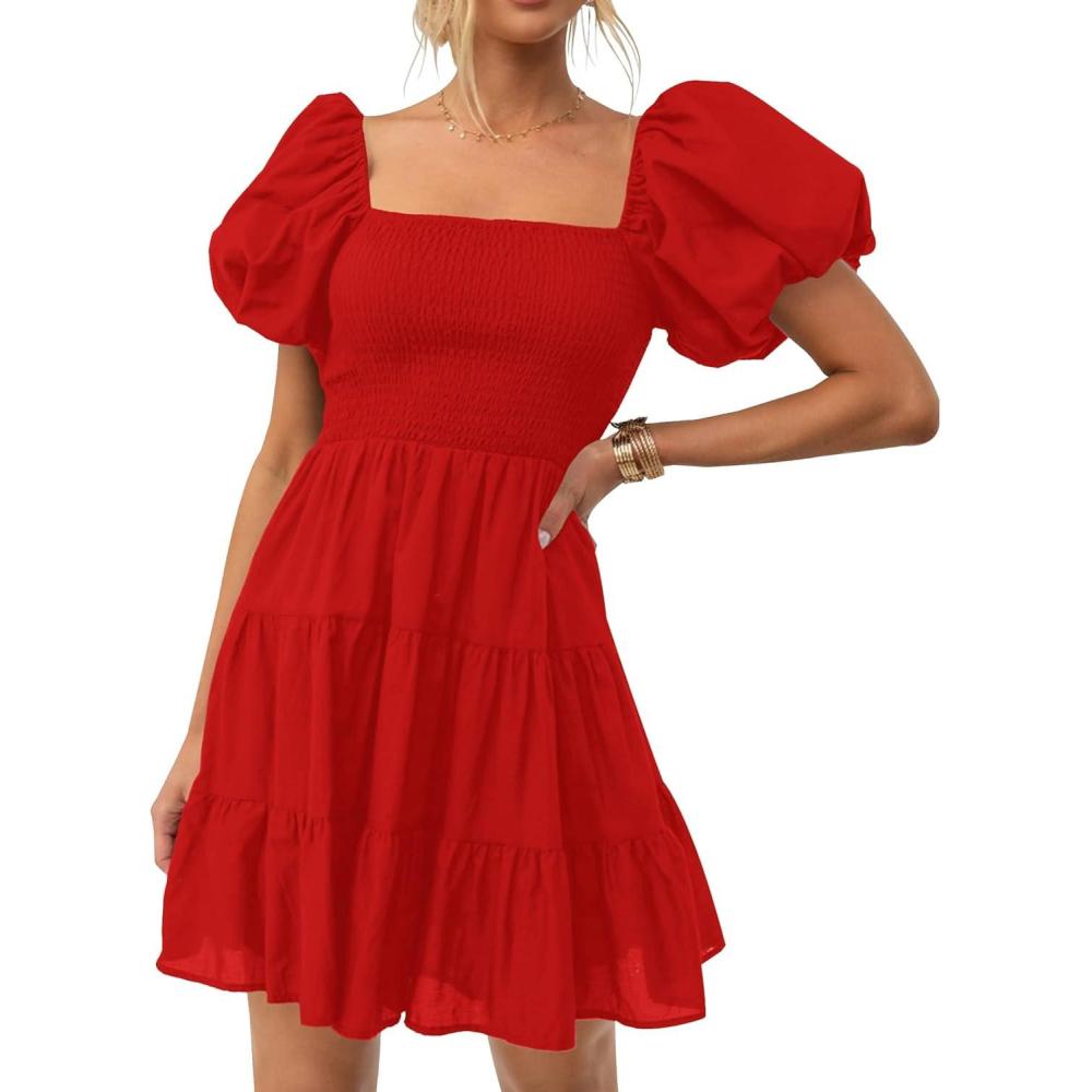 ZESICA Women's Boho 2025 Summer Square Neck Puff Sleeve Off Shoulder Smocked Tiered Casual A Line Short Mini Dress(Firered)