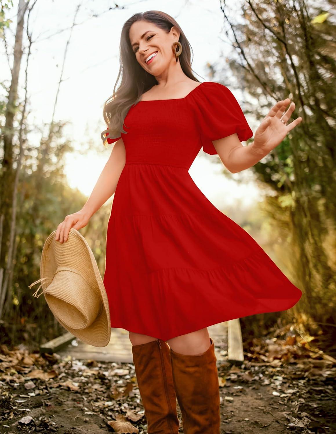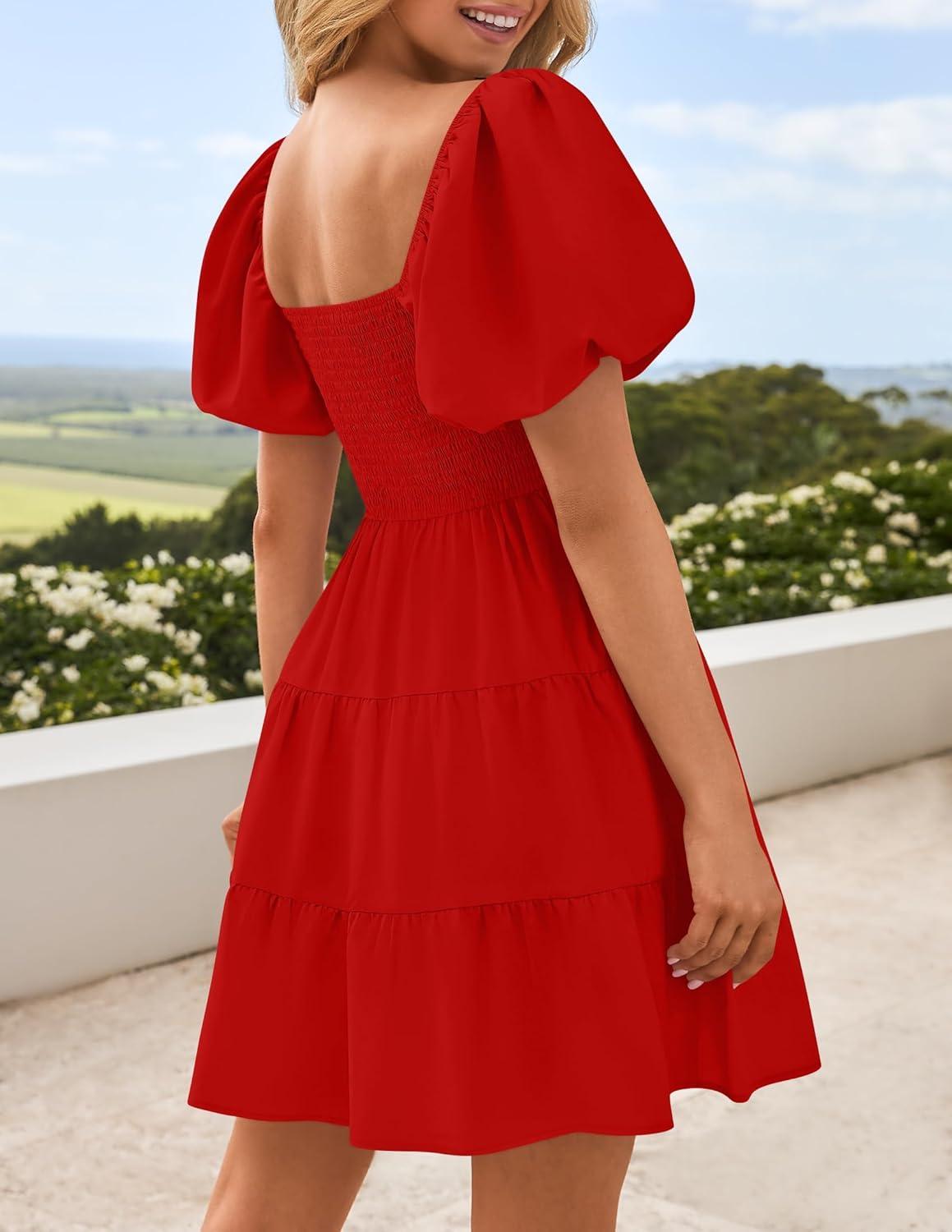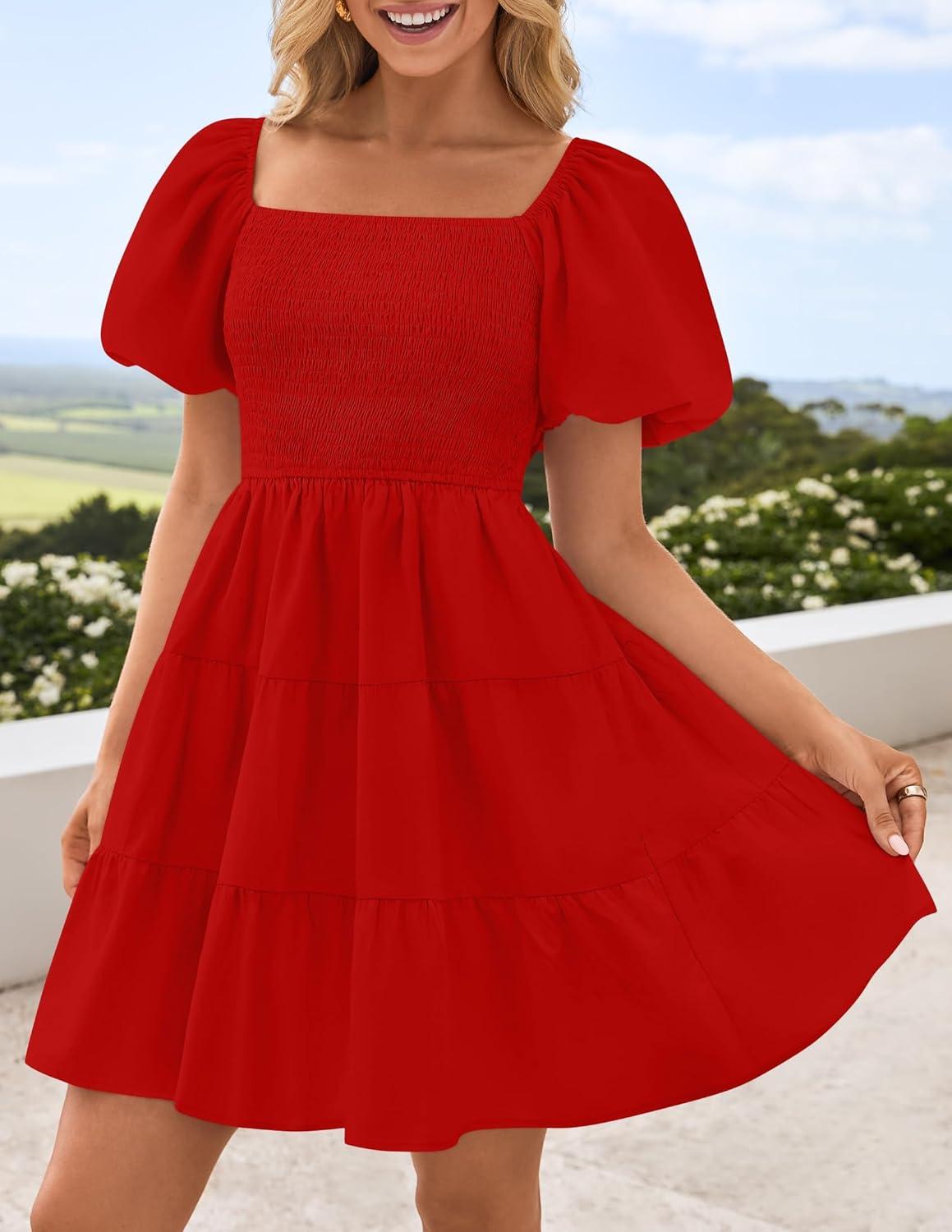 ZESICA Women's Boho 2025 Summer Square Neck Puff Sleeve Off Shoulder Smocked Tiered Casual A Line Short Mini Dress(Firered)
