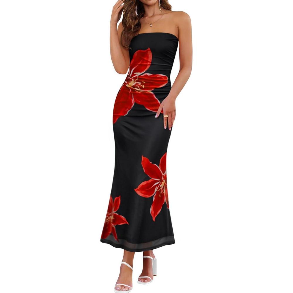 ZESICA Womens Boho Floral Strapless Midi Dress 2025 Summer Off Shoulder Bodycon Beach Party Long Dresses(Black)