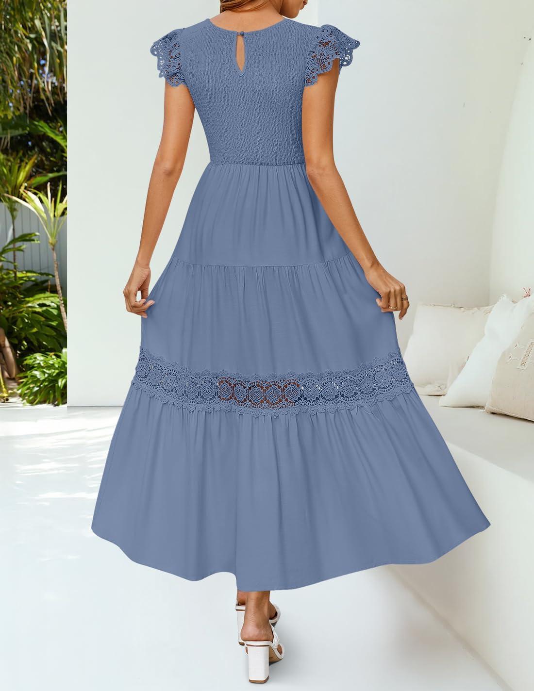 ZESICA Women’s Casual Crew Neck Flutter Sleeve Smocked High Waist Hollow Out Lace Trim Tiered A Line Midi Dress(Dustyblue)
