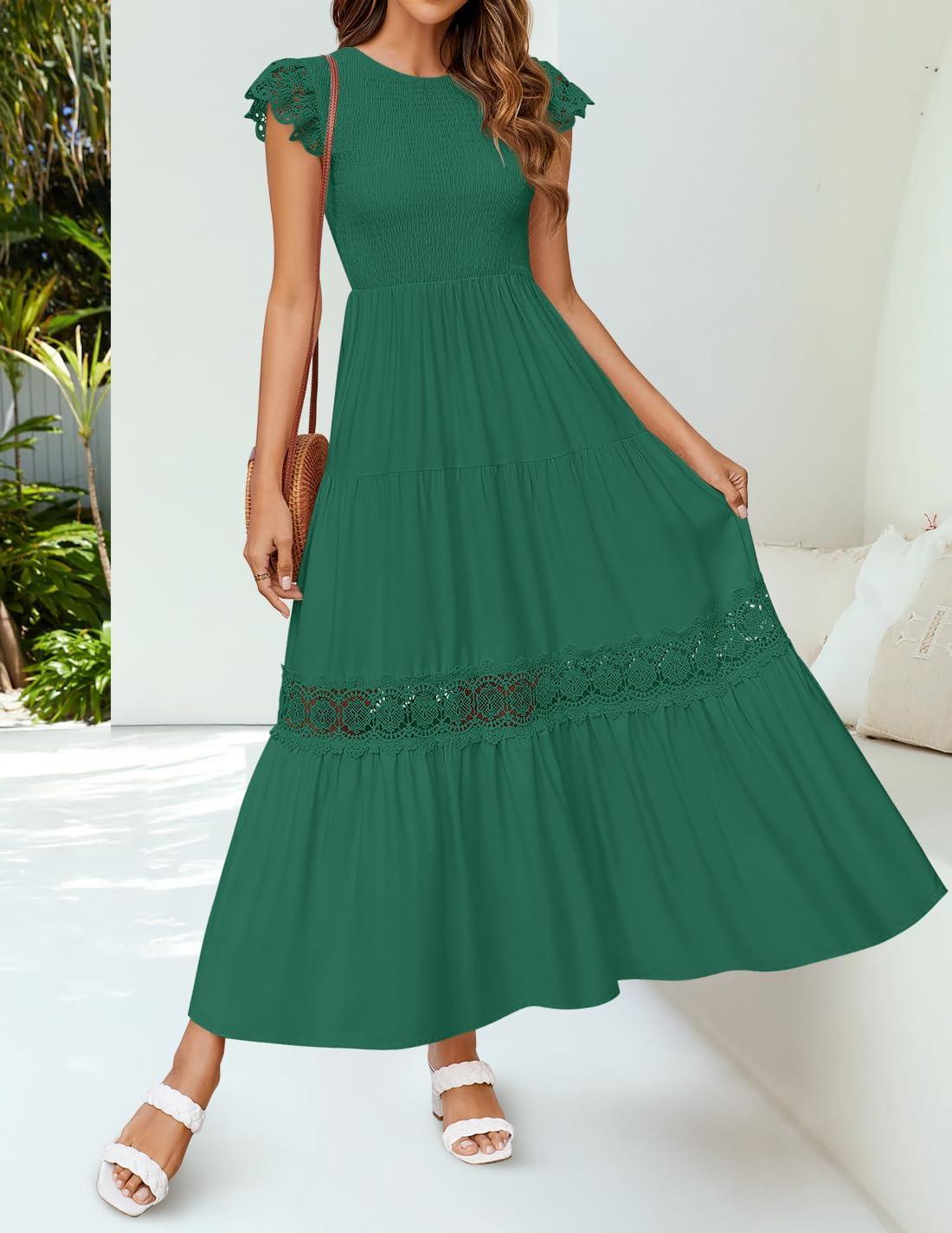 ZESICA Women’s Casual Crew Neck Flutter Sleeve Smocked High Waist Hollow Out Lace Trim Tiered A Line Midi Dress(Forestgreen)