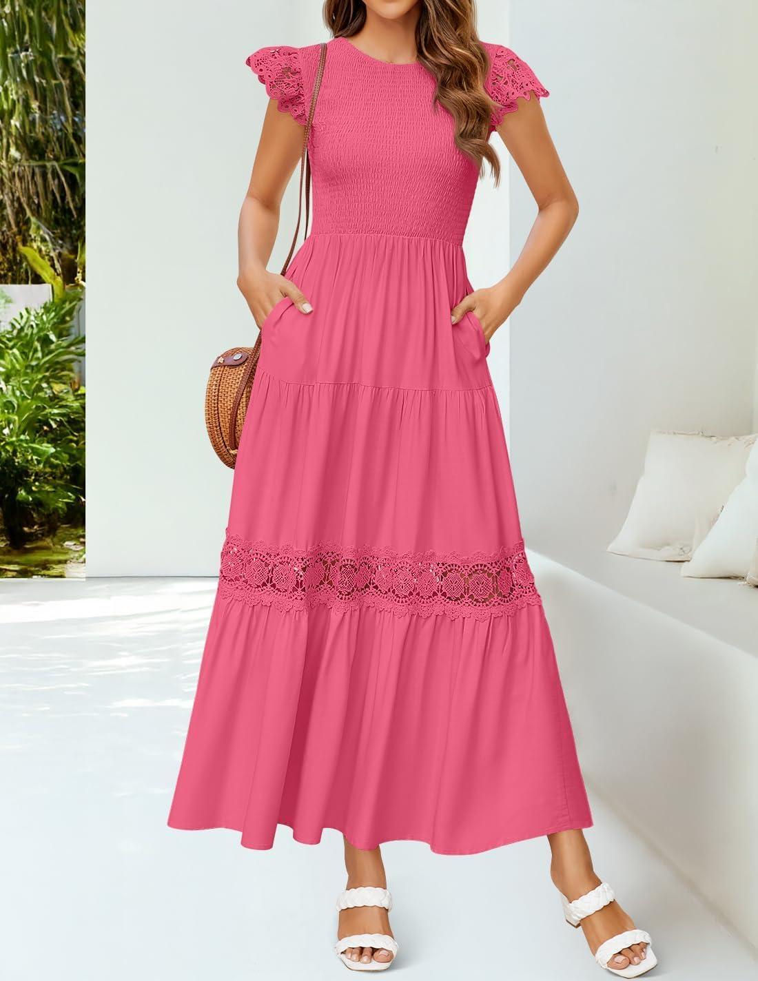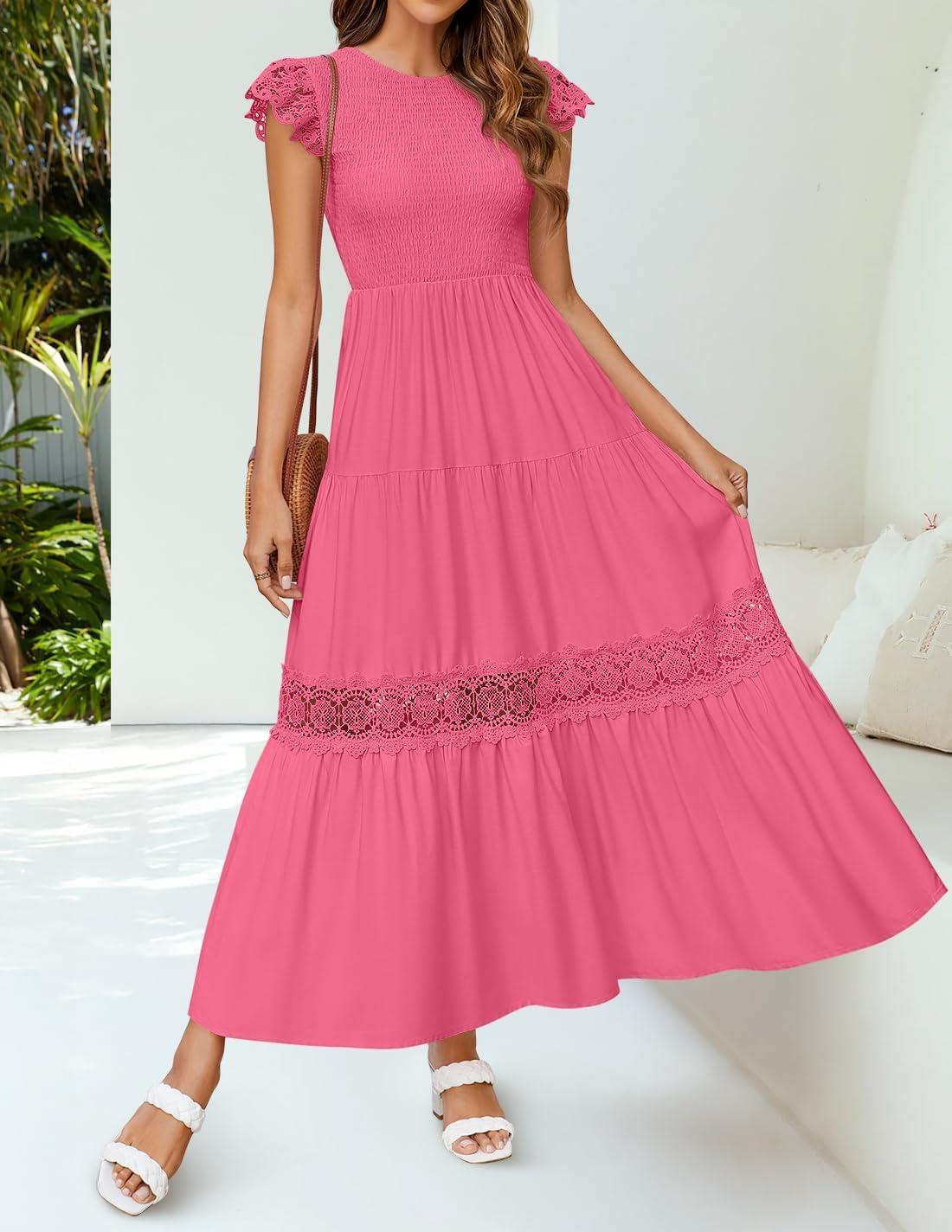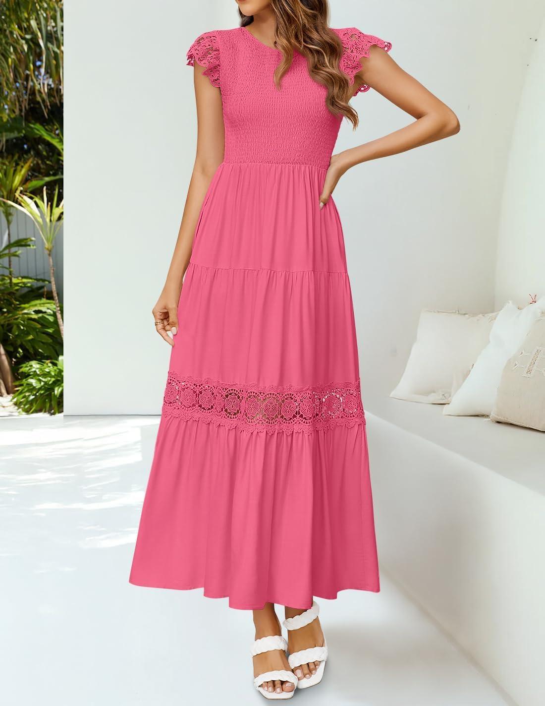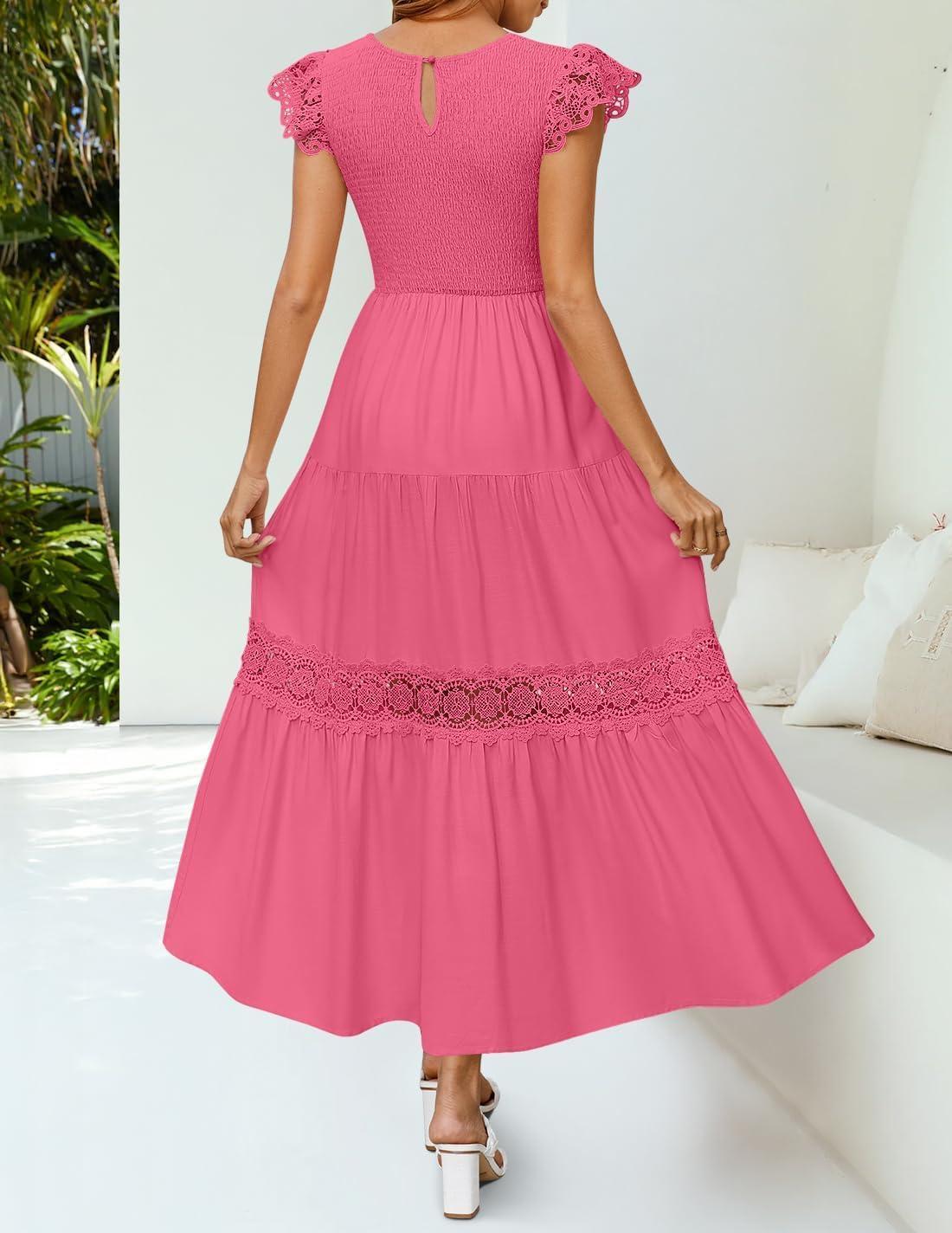 ZESICA Women’s Casual Crew Neck Flutter Sleeve Smocked High Waist Hollow Out Lace Trim Tiered A Line Midi Dress(Hotpink)