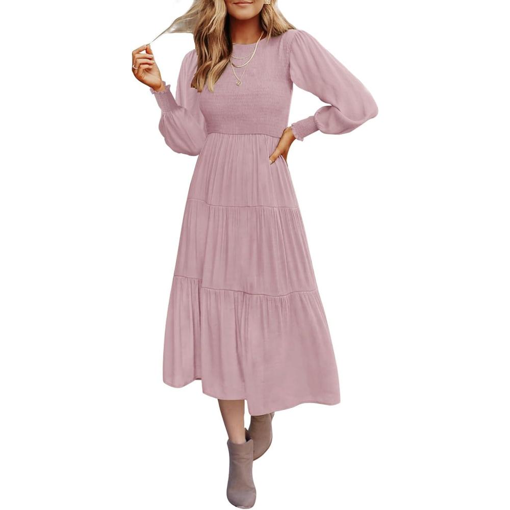 ZESICA Women’s Casual Long Sleeve Crew Neck High Waist Smocked Flowy Tiered Midi Dress(Darkpink)
