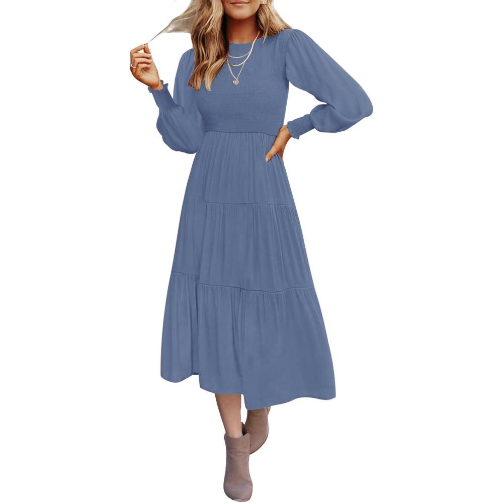 ZESICA Women’s Casual Long Sleeve Crew Neck High Waist Smocked Flowy Tiered Midi Dress(Dustyblue)