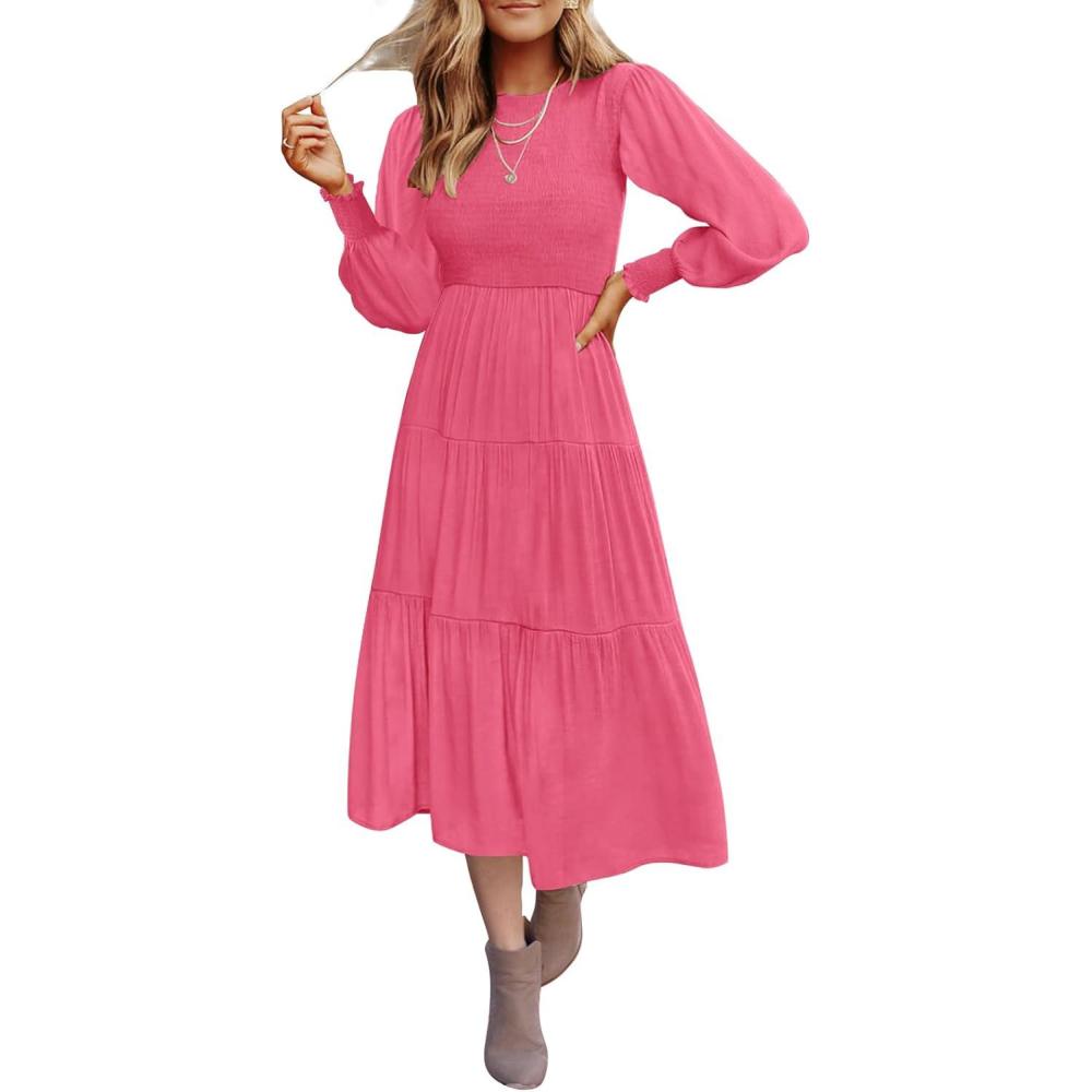 ZESICA Women’s Casual Long Sleeve Crew Neck High Waist Smocked Flowy Tiered Midi Dress(Hotpink)