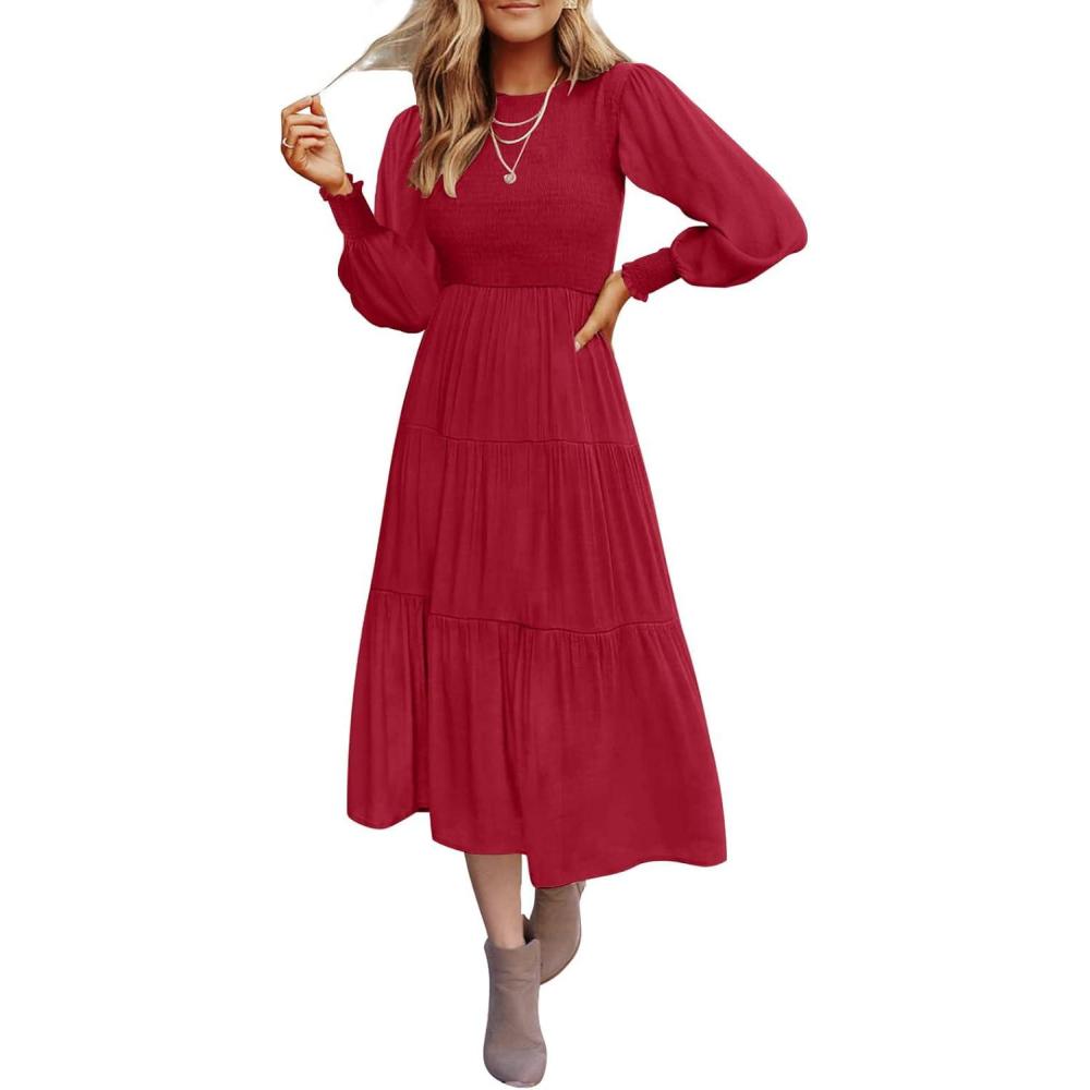 ZESICA Women’s Casual Long Sleeve Crew Neck High Waist Smocked Flowy Tiered Midi Dress(Red)
