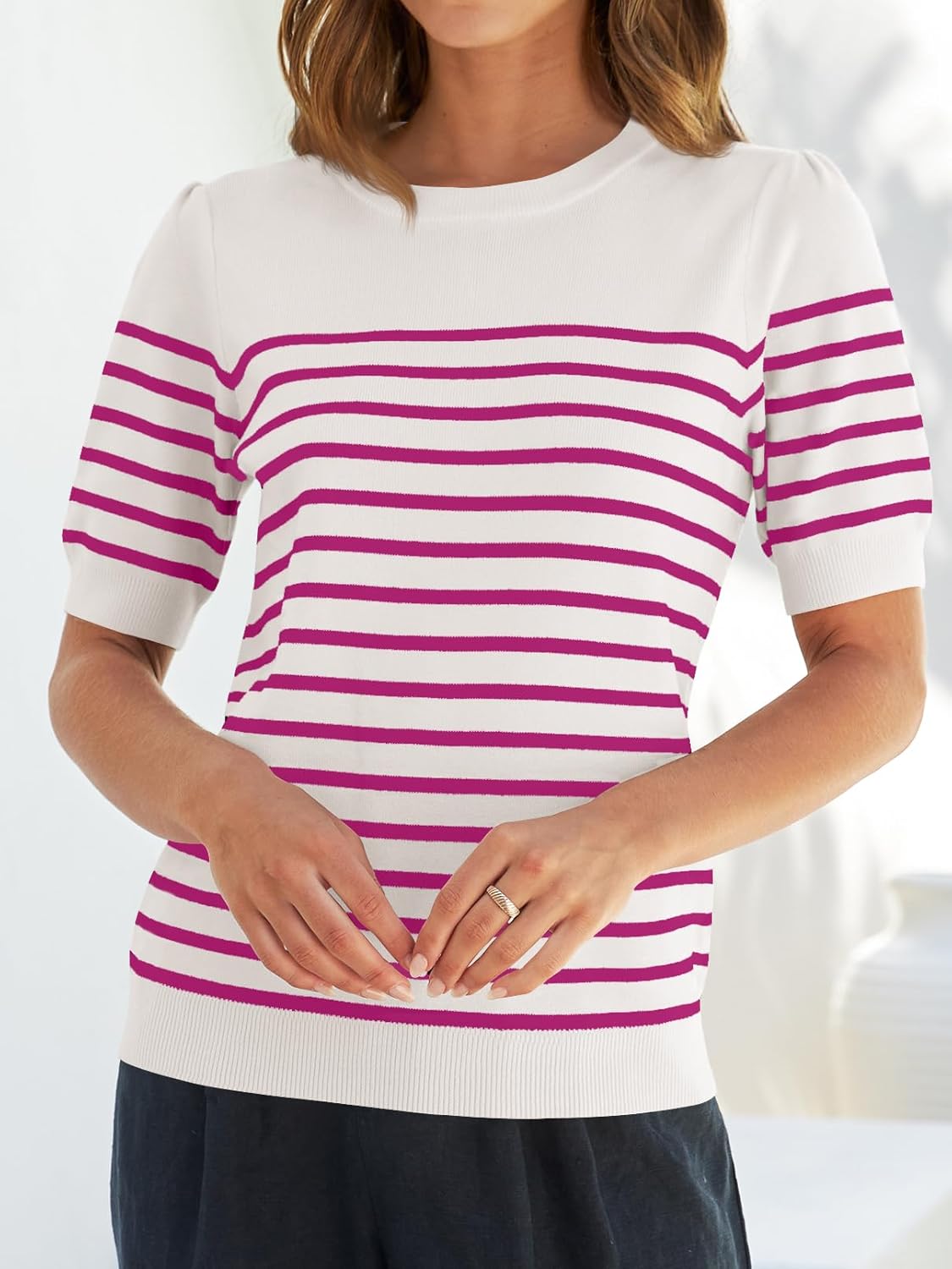 Save big on ZESICA Women’s Casual Striped Tops Short Sleeve Crew Neck Ribbed Knit T Shirts Comfy Loose Basic Pullover Sweater(Rosered) and accessories during our BOGO sale. Buy one, get one 50% off!