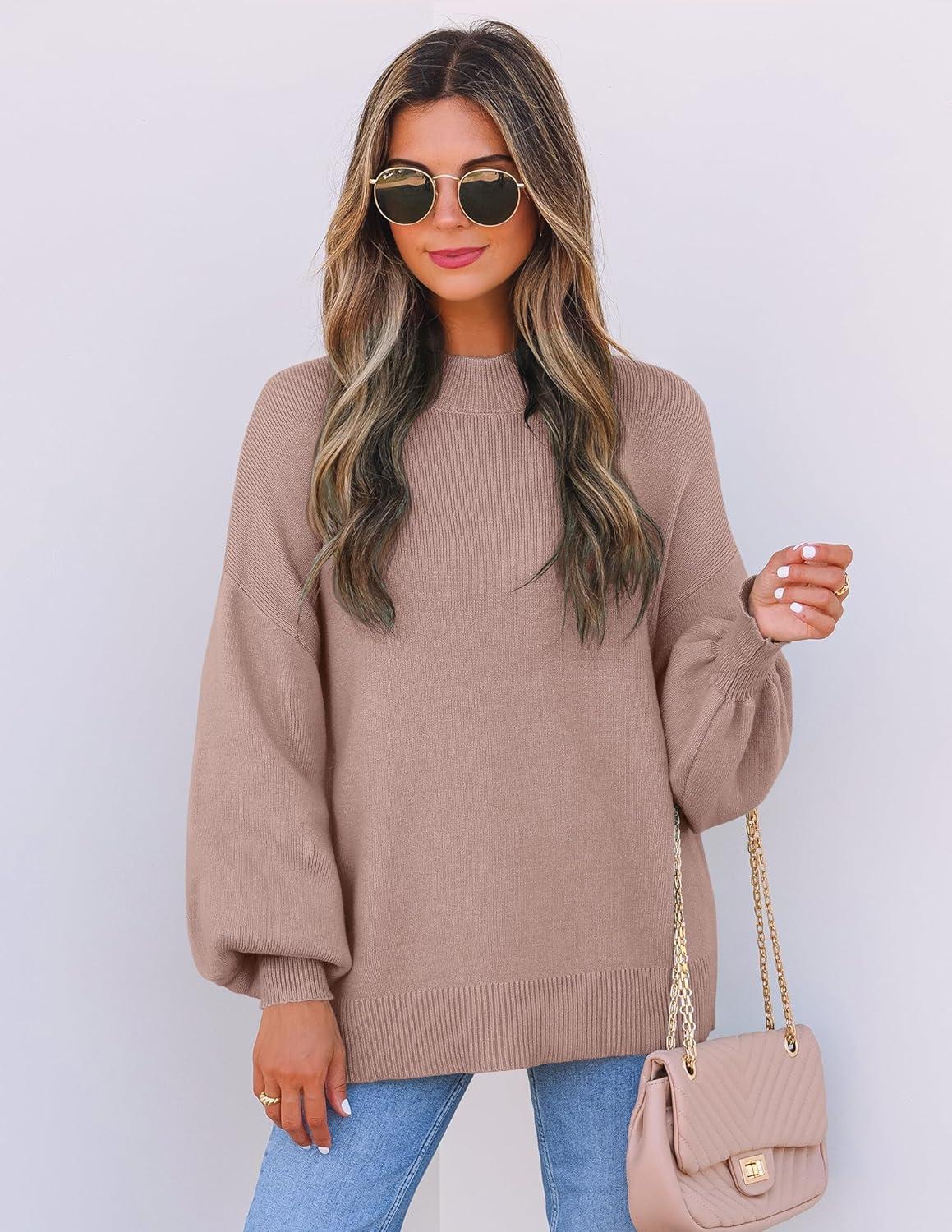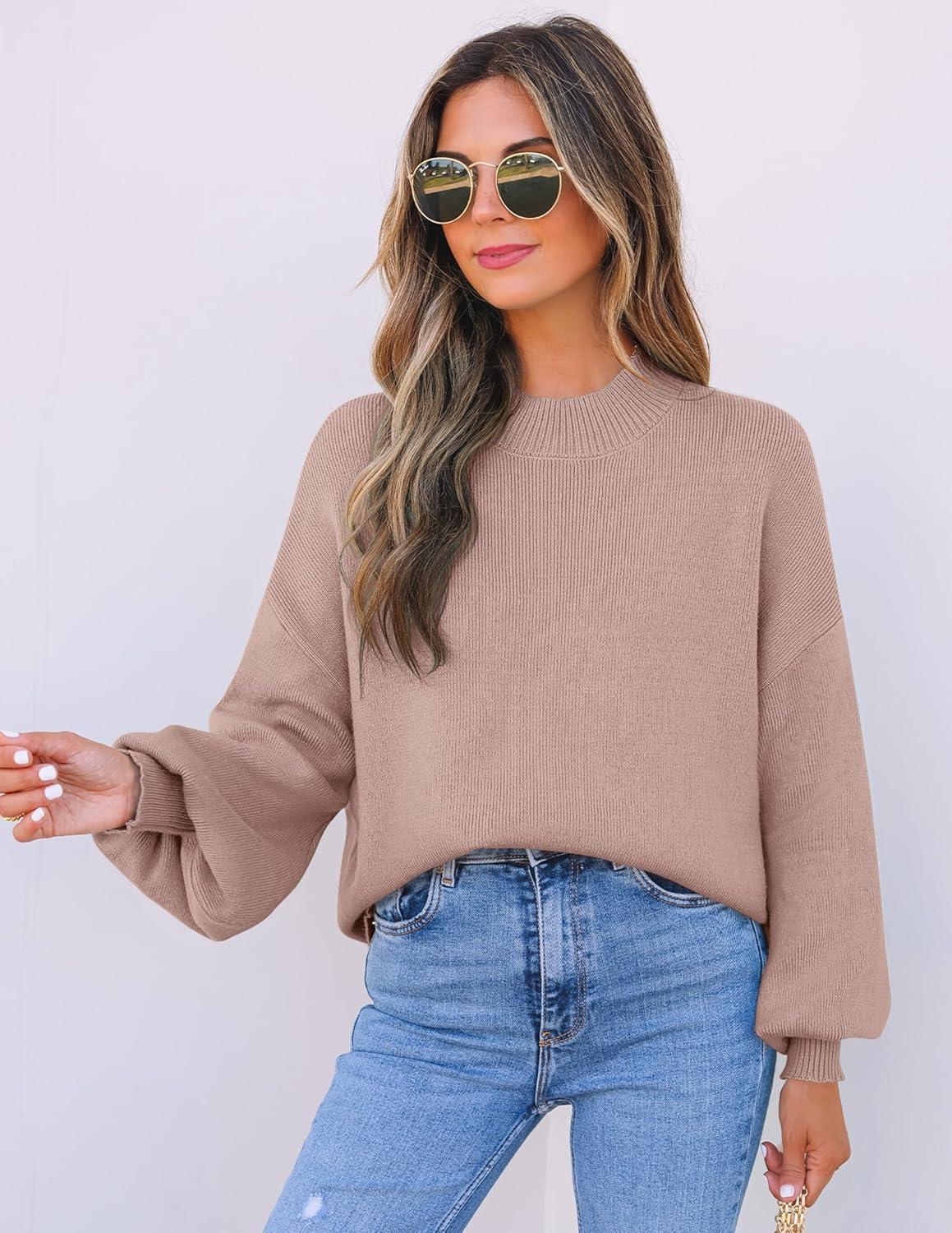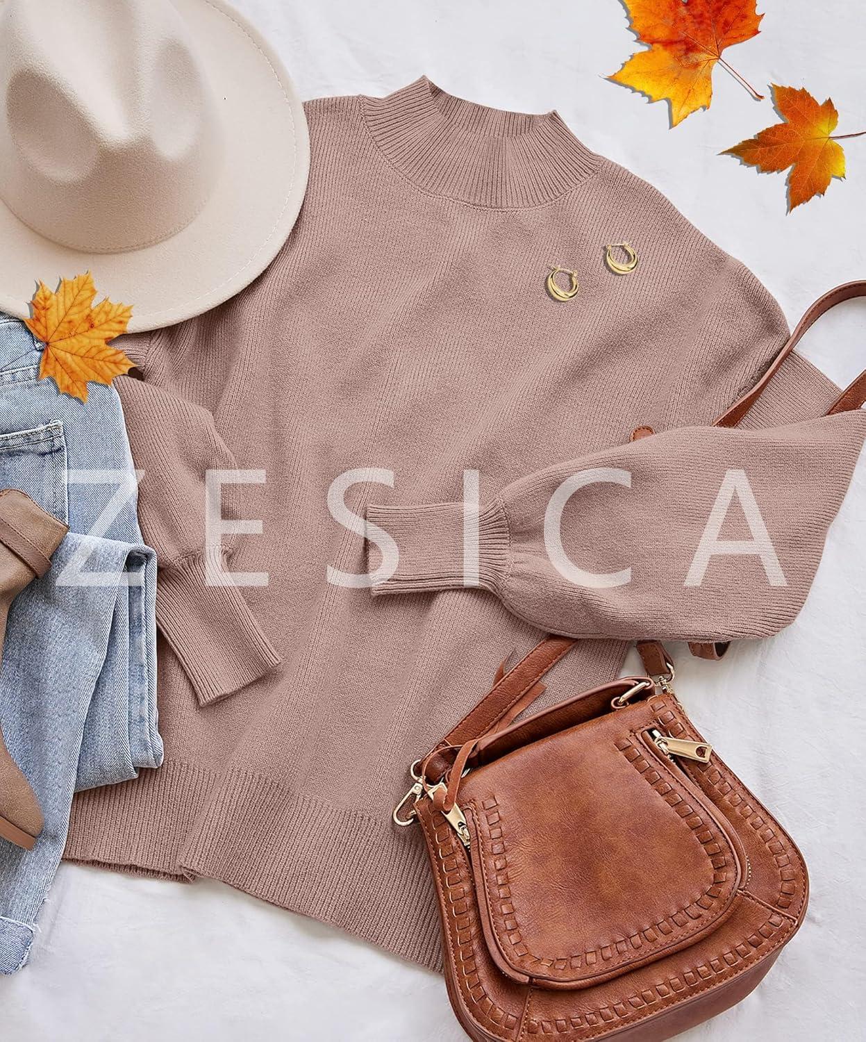 ZESICA Women’s Casual Turtleneck Long Lantern Sleeve Fall 2025 Oversized Ribbed Knit Pullover Sweater Jumper Top(Almond)