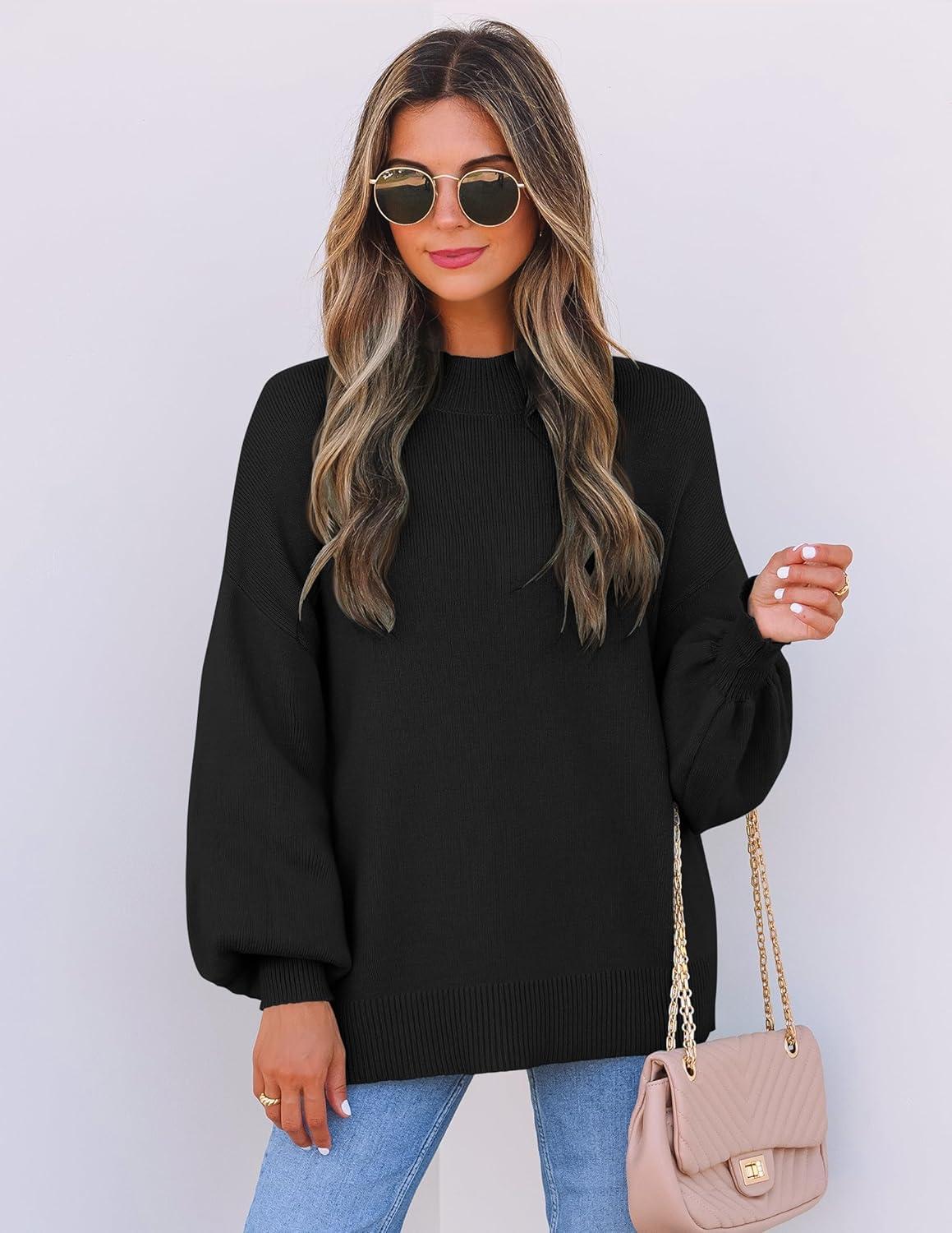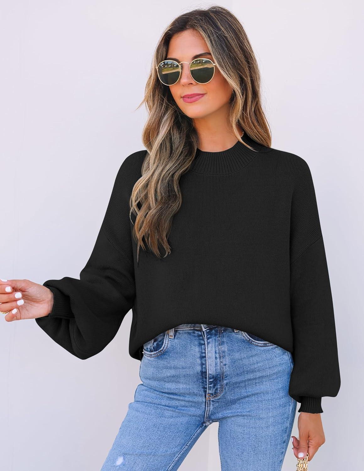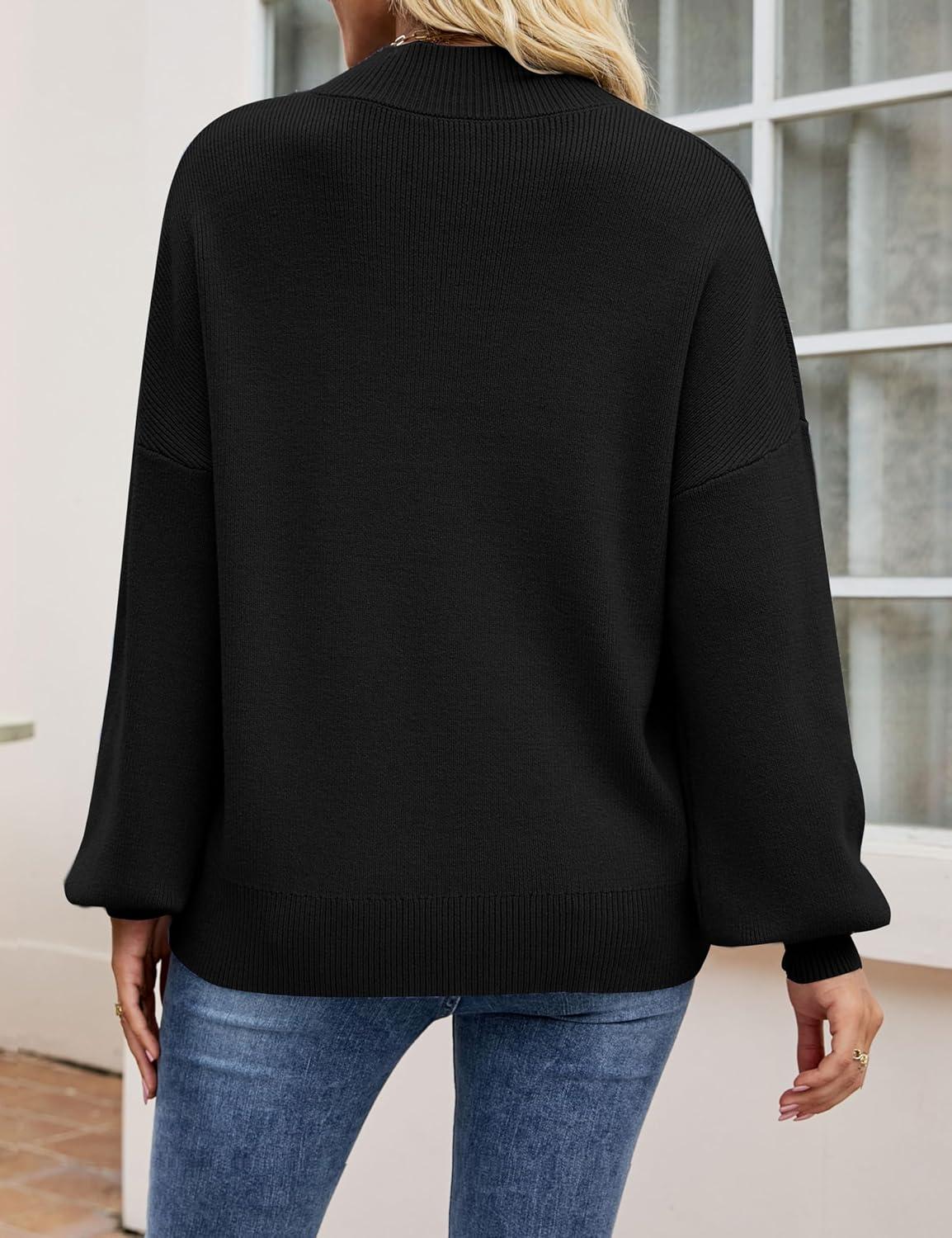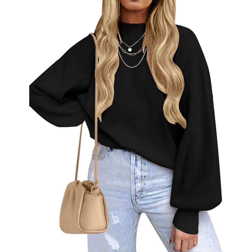 ZESICA Women’s Casual Turtleneck Long Lantern Sleeve Fall 2025 Oversized Ribbed Knit Pullover Sweater Jumper Top(Black)