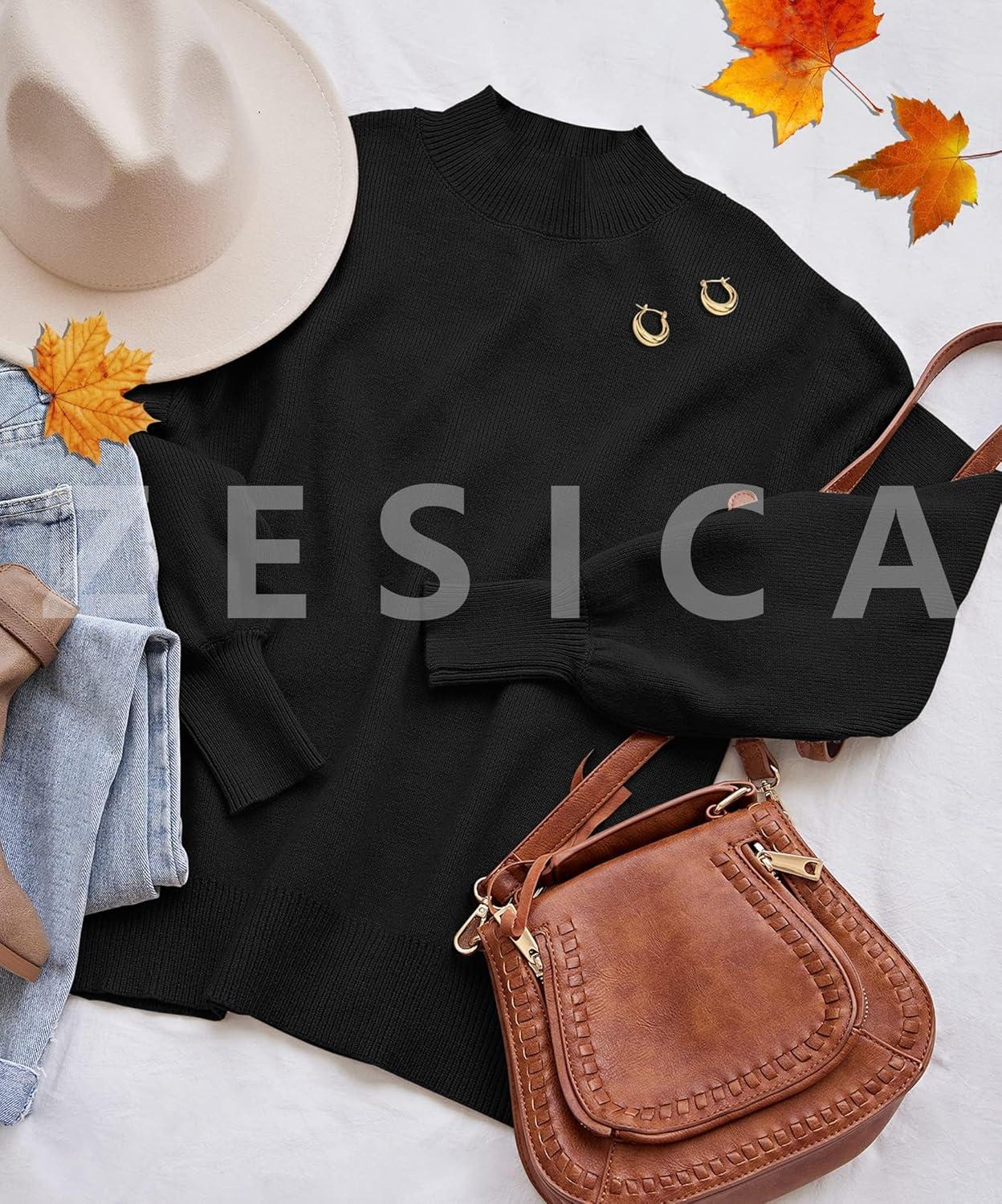 ZESICA Women's Casual Turtleneck Long Lantern Sleeve Fall 2025 Oversized Ribbed Knit Pullover Sweater Jumper Top(Black)