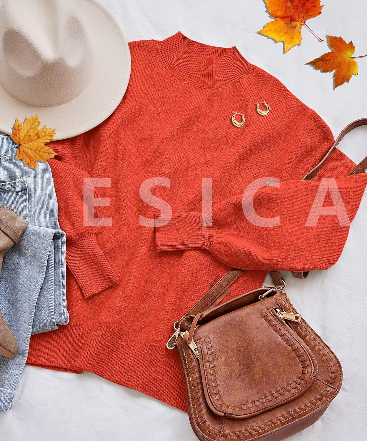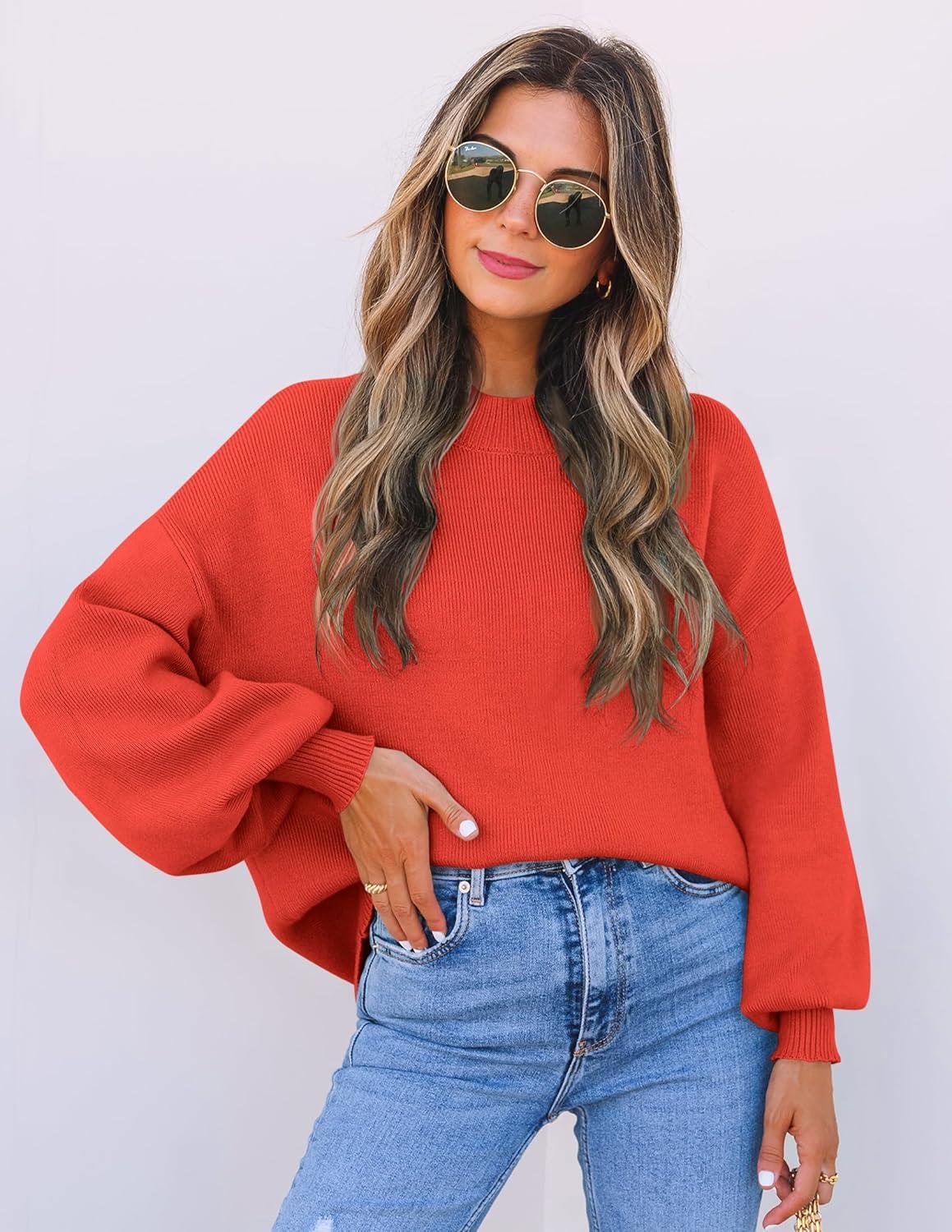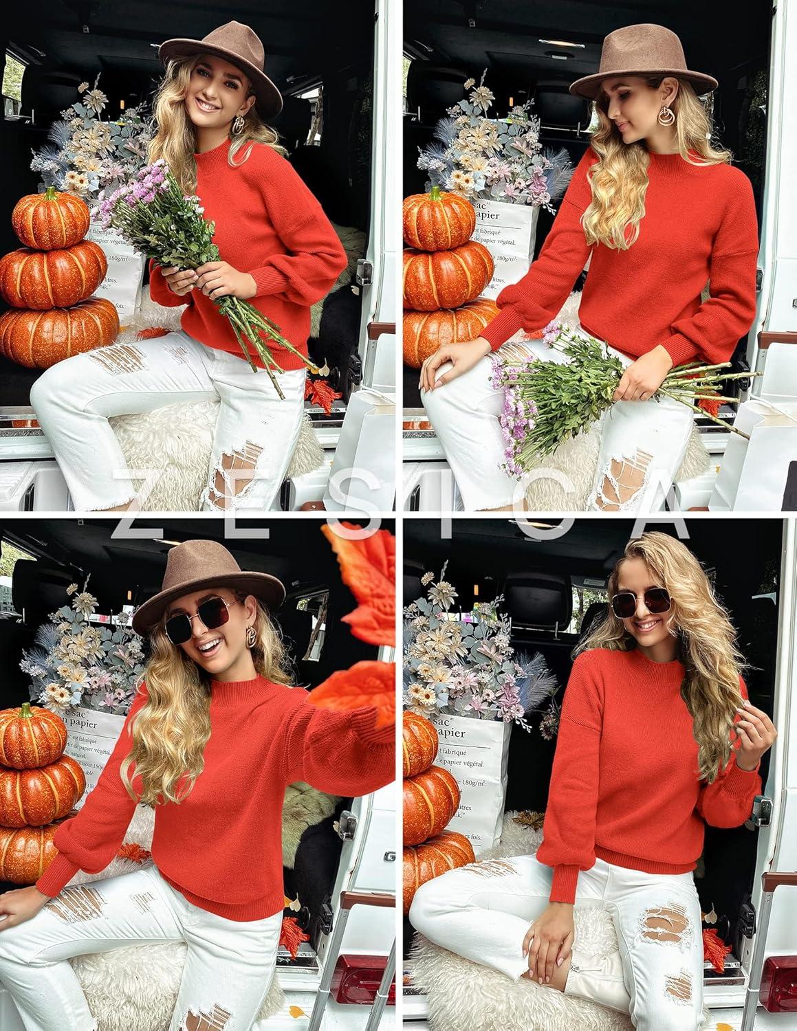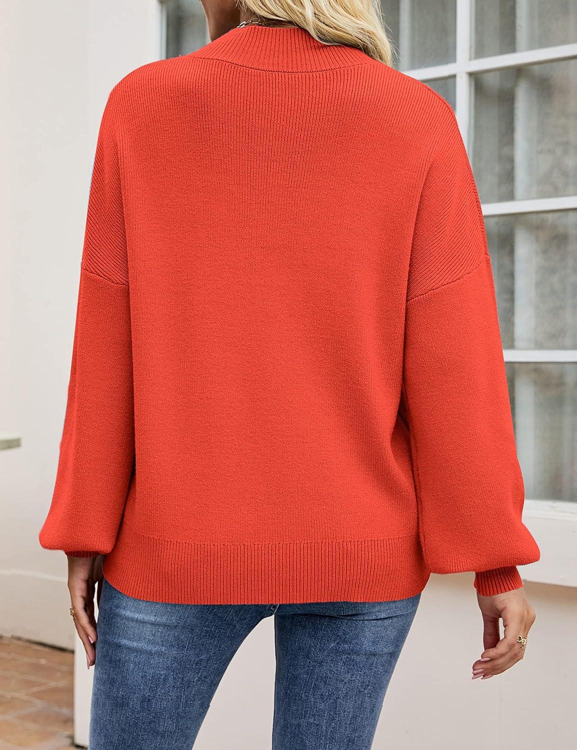ZESICA Women’s Casual Turtleneck Long Lantern Sleeve Fall 2025 Oversized Ribbed Knit Pullover Sweater Jumper Top(Firered)