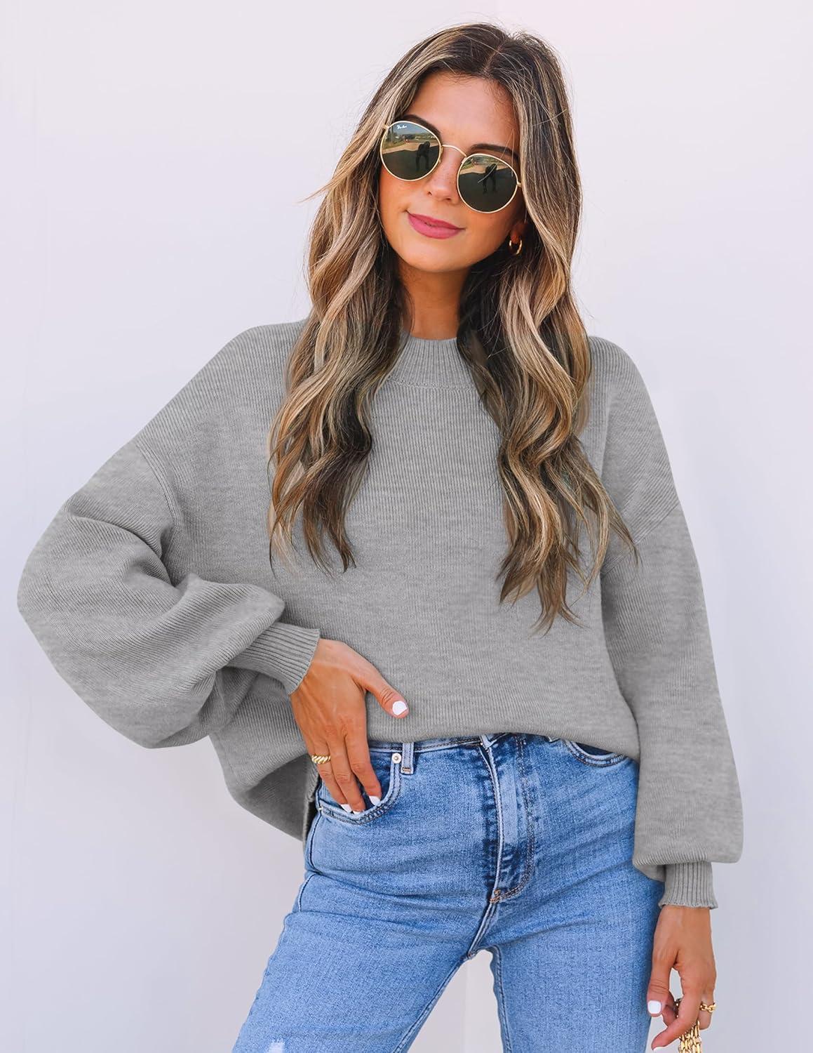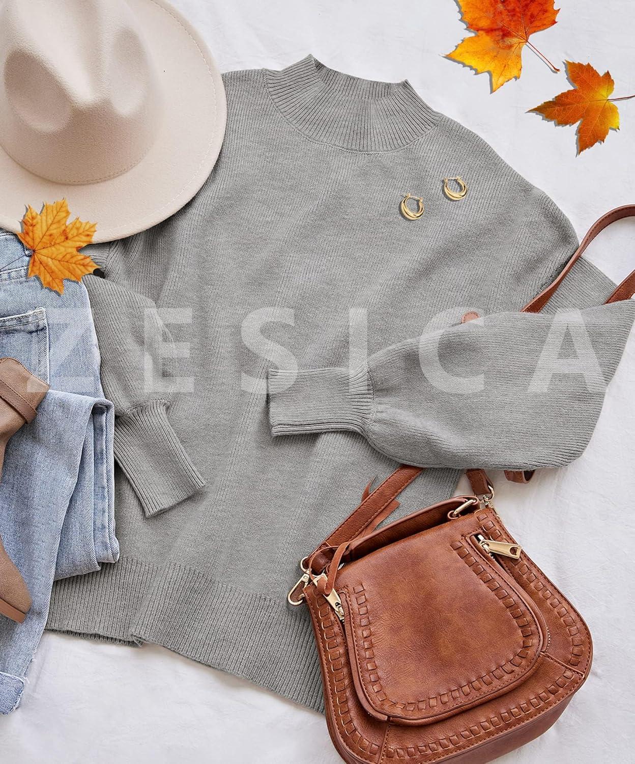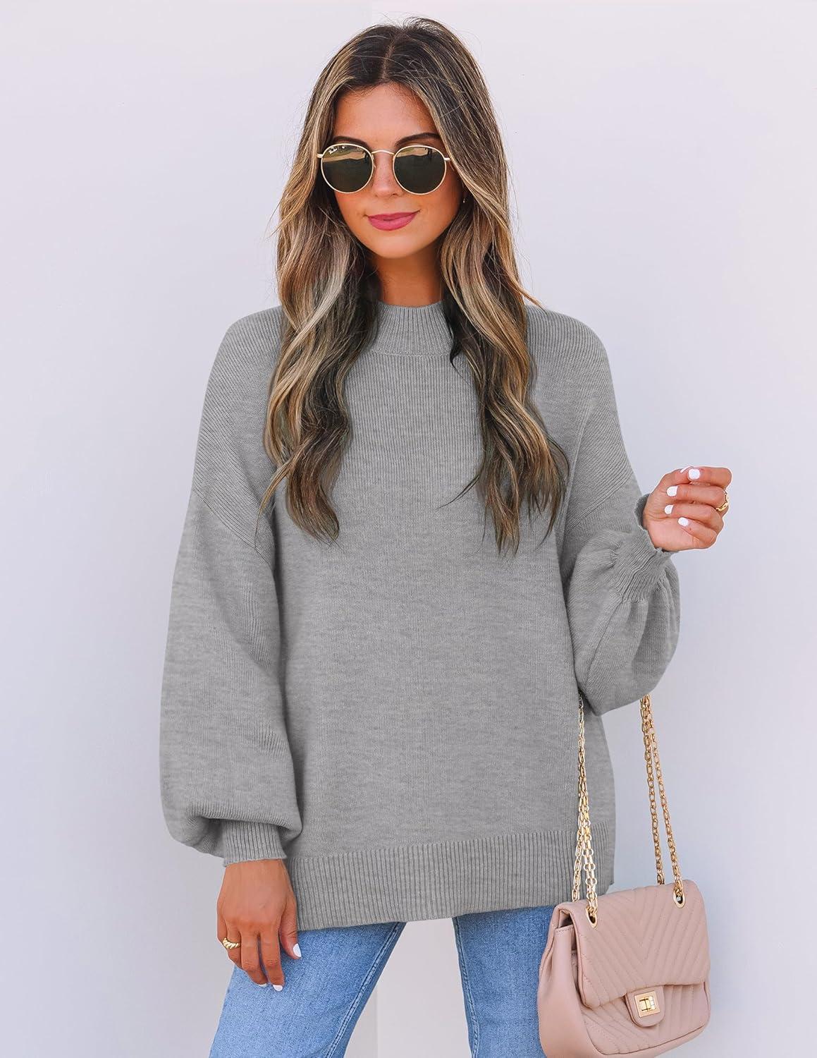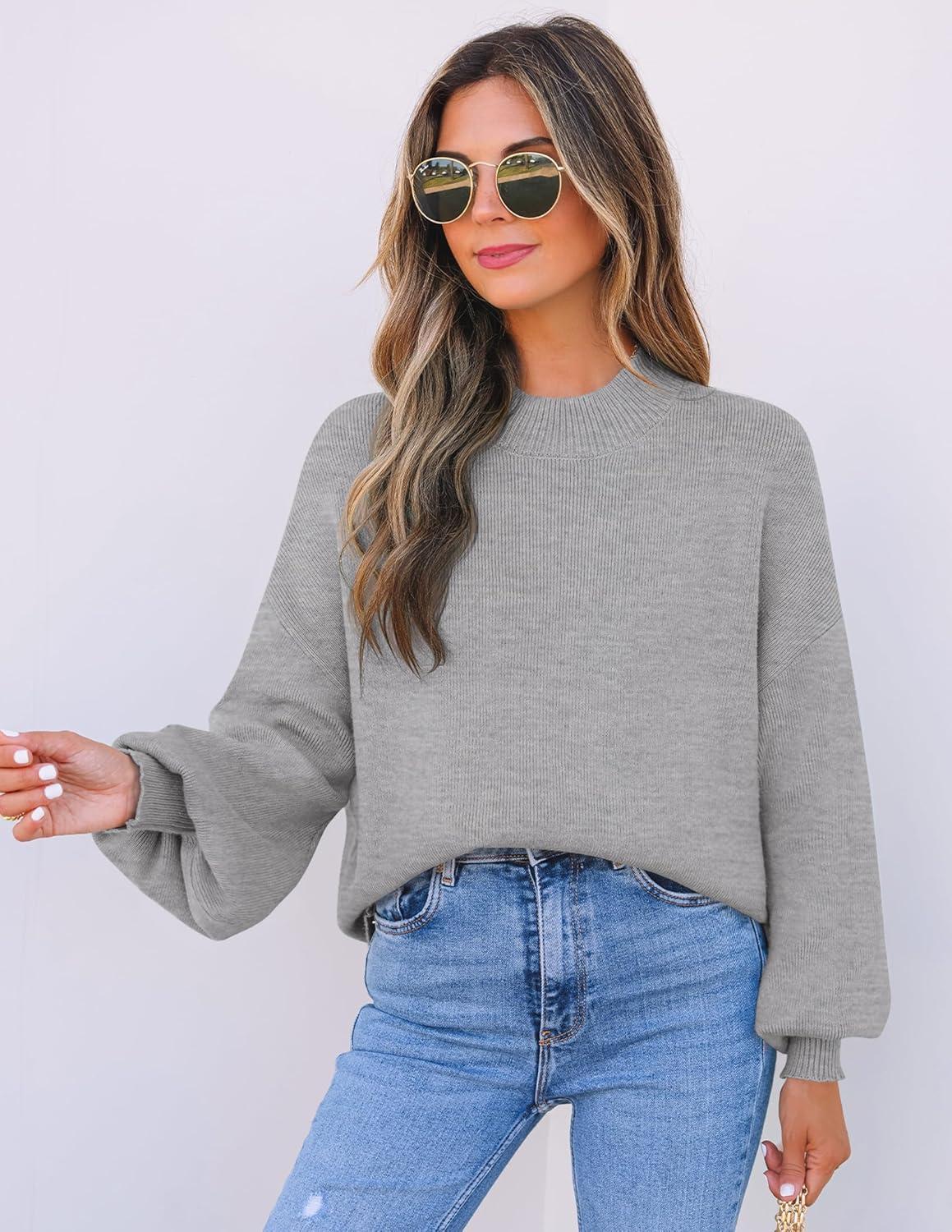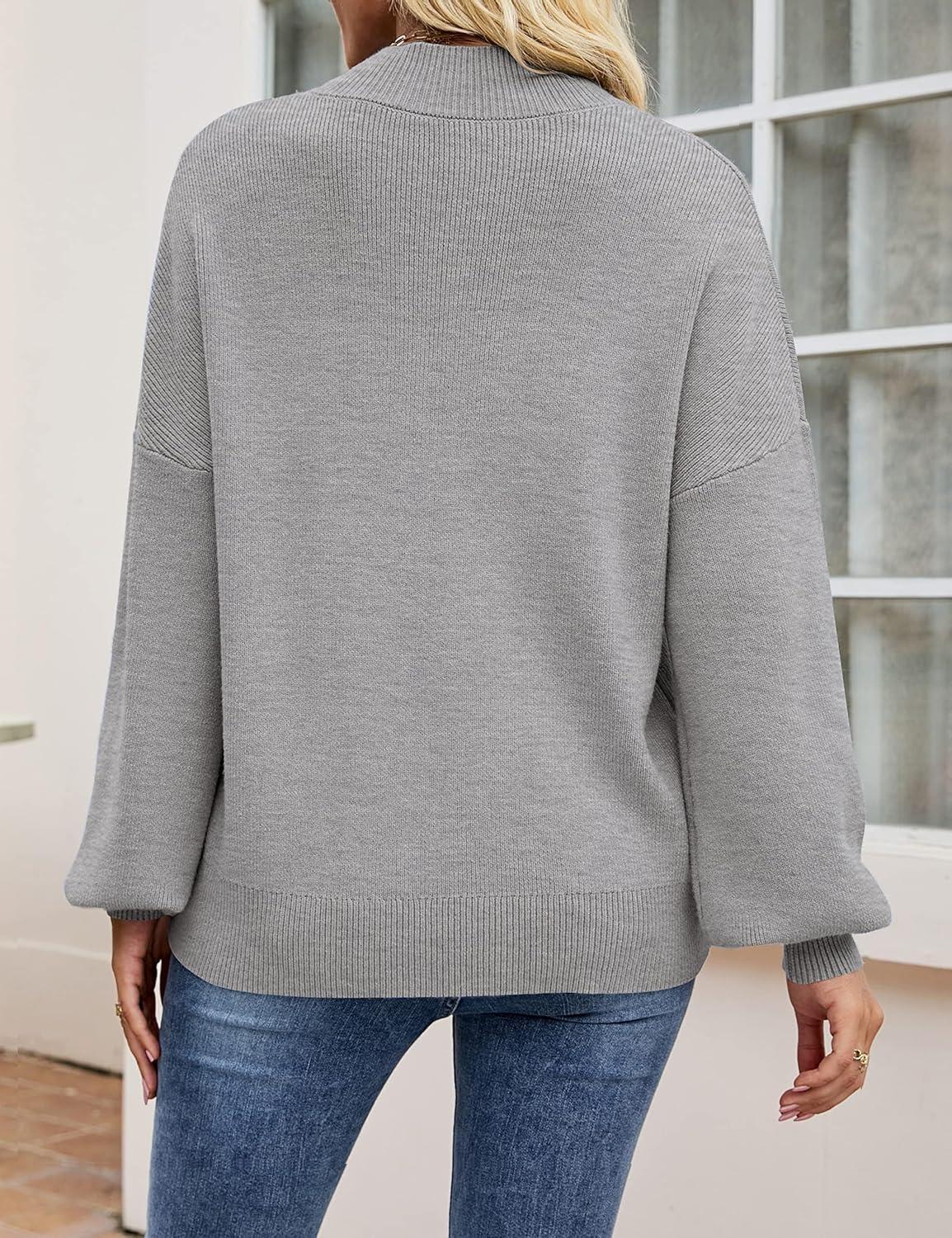 ZESICA Women’s Casual Turtleneck Long Lantern Sleeve Fall 2025 Oversized Ribbed Knit Pullover Sweater Jumper Top(Grey)