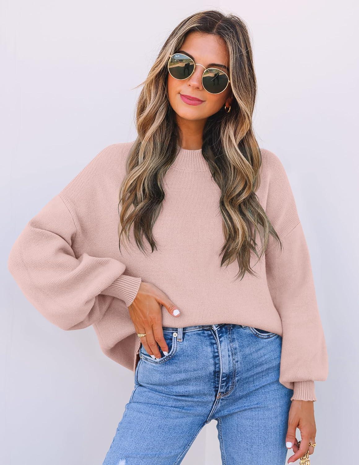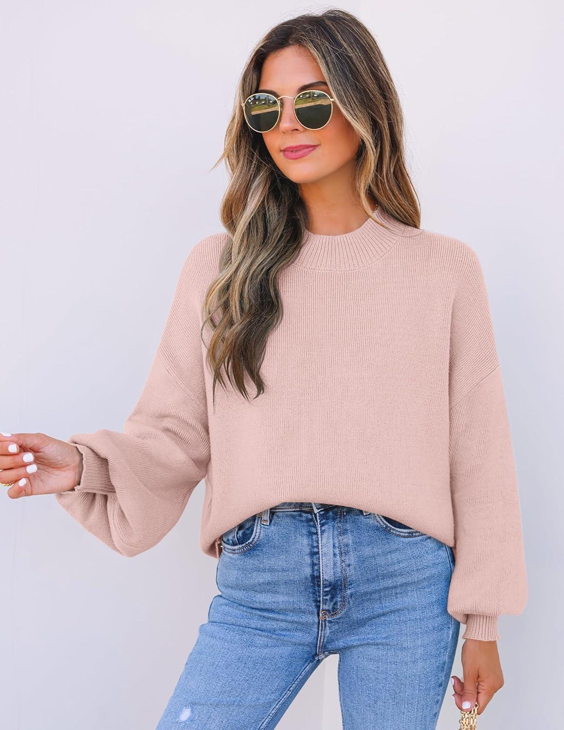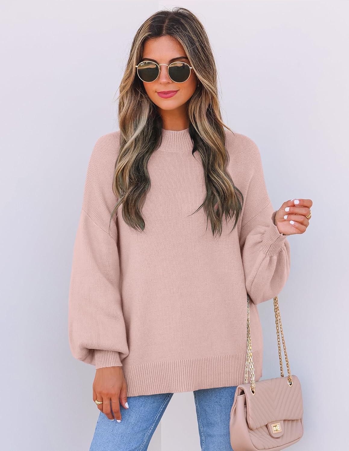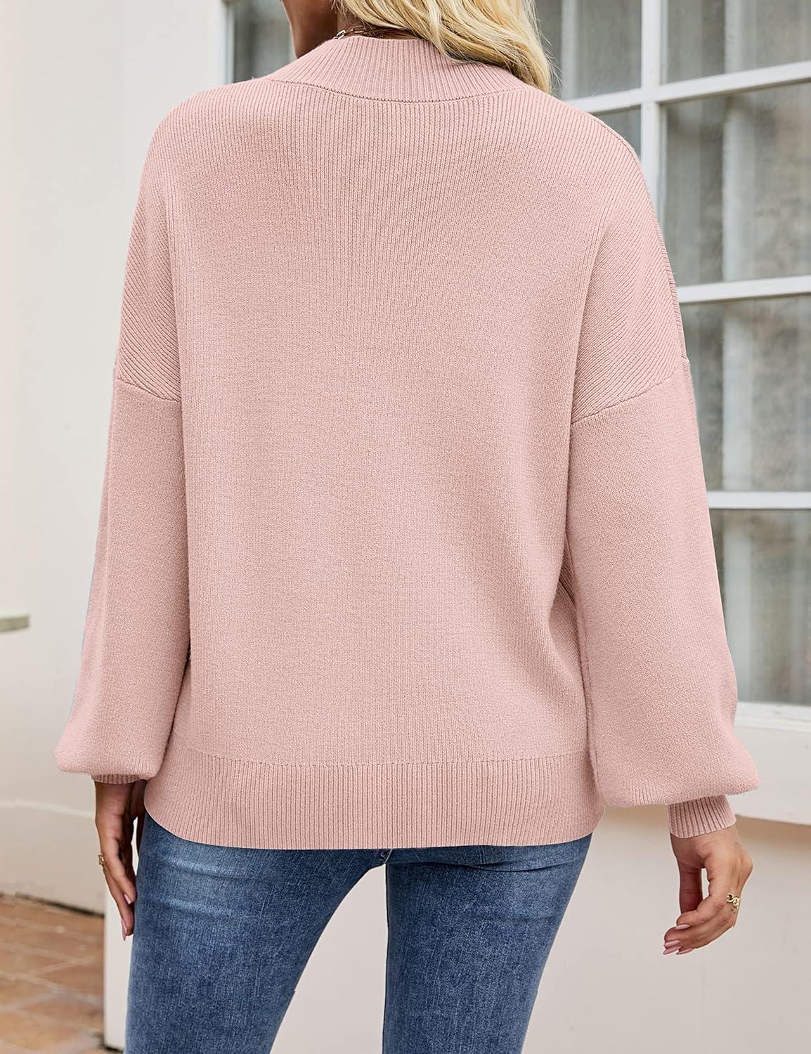 ZESICA Women’s Casual Turtleneck Long Lantern Sleeve Fall 2025 Oversized Ribbed Knit Pullover Sweater Jumper Top(Pink)