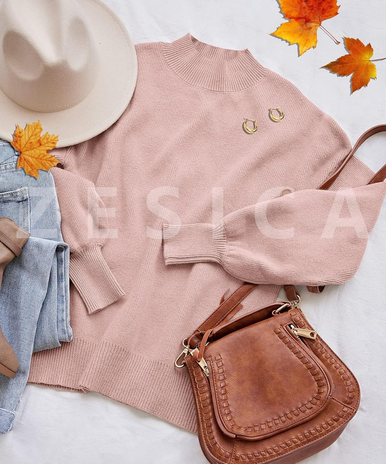 imageZESICA Womens Casual Turtleneck Long Lantern Sleeve Fall 2025 Oversized Ribbed Knit Pullover Sweater Jumper TopPink