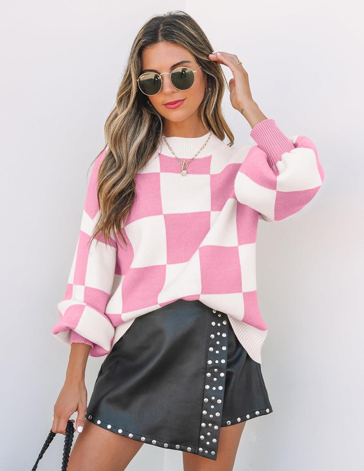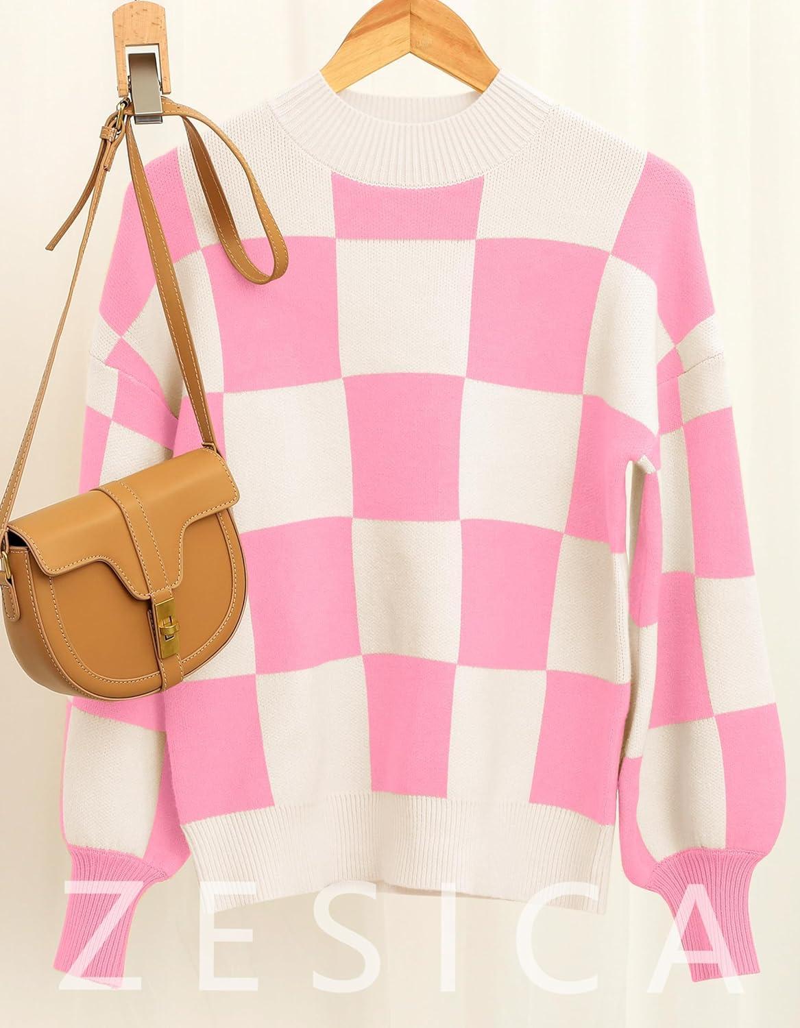 ZESICA Women’s Casual Turtleneck Long Lantern Sleeve Fall 2025 Oversized Ribbed Knit Pullover Sweater Jumper Top(Pinkplaid)