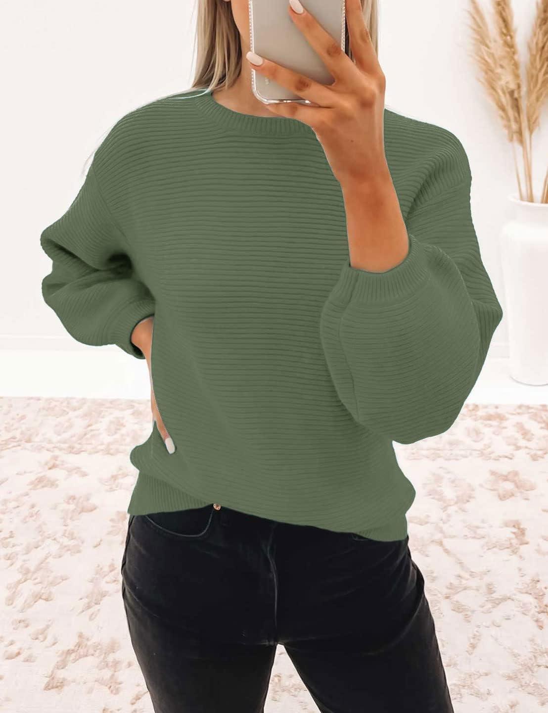 ZESICA Women’s Crew Neck Long Lantern Sleeve Fall 2025 Casual Loose Ribbed Knit Solid Soft Pullover Sweater Tops(Armygreen)