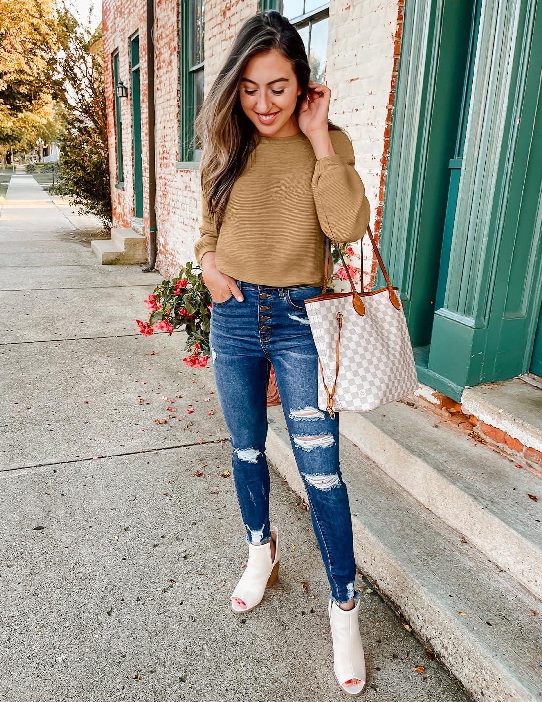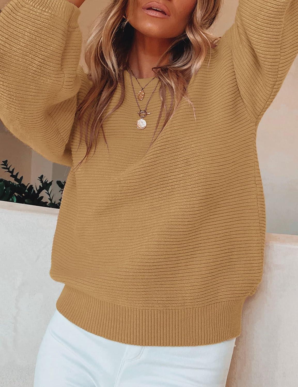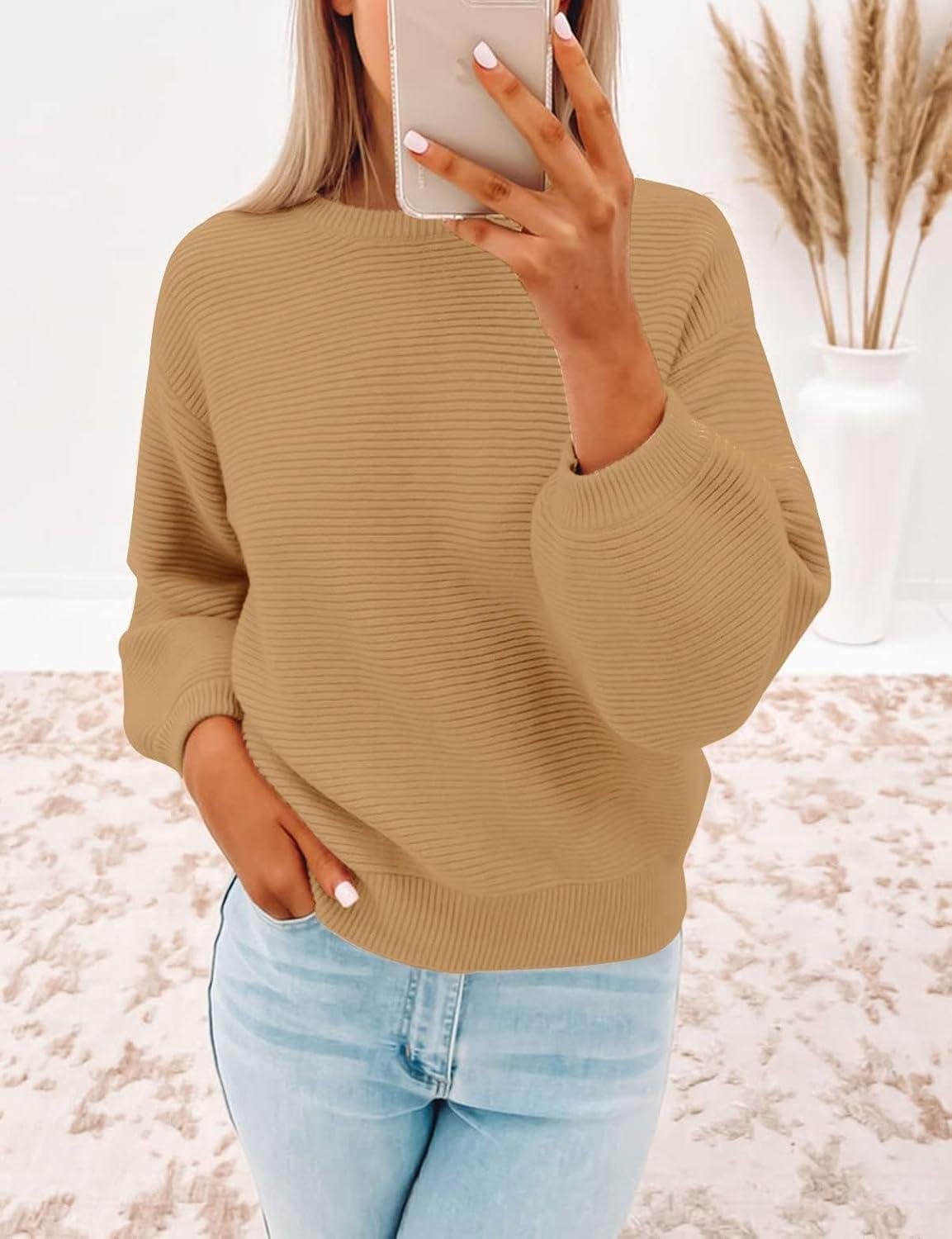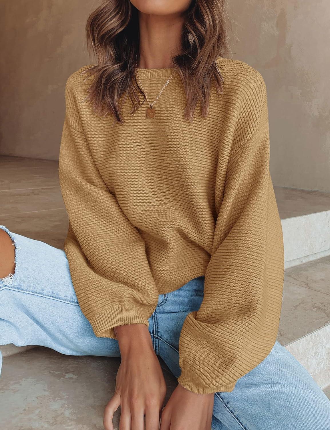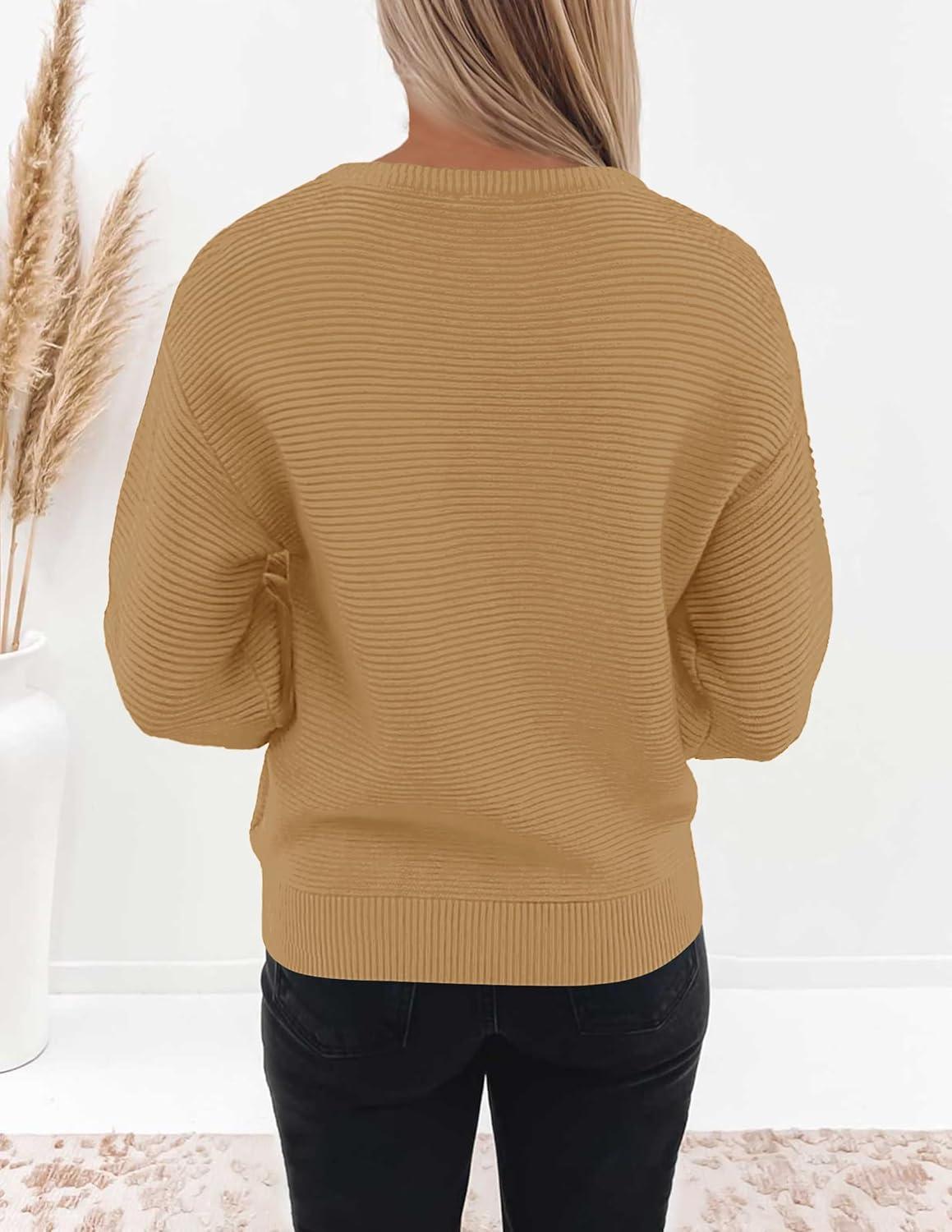 ZESICA Women’s Crew Neck Long Lantern Sleeve Fall 2025 Casual Loose Ribbed Knit Solid Soft Pullover Sweater Tops(Camel)