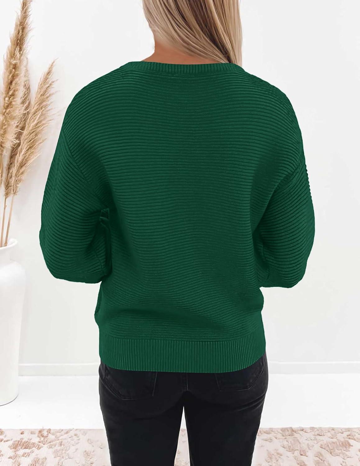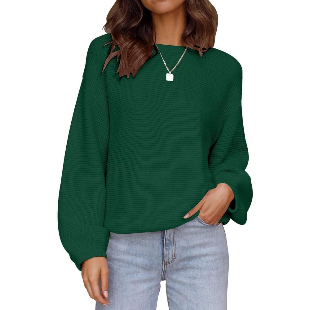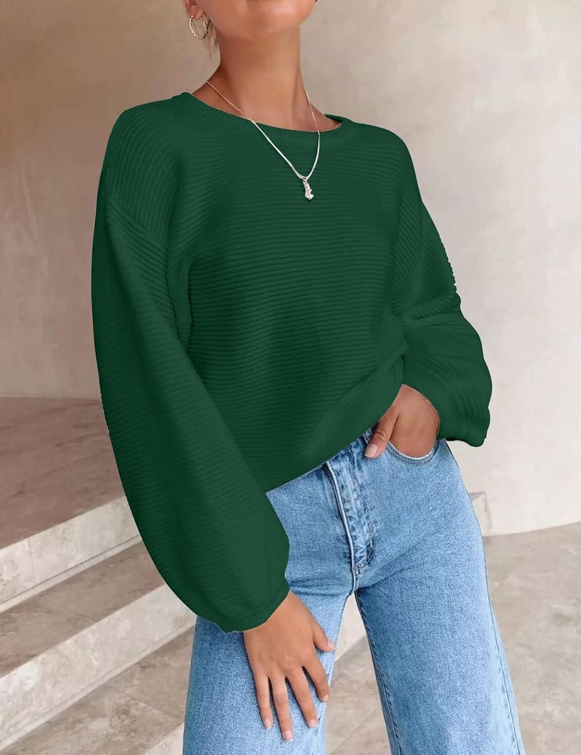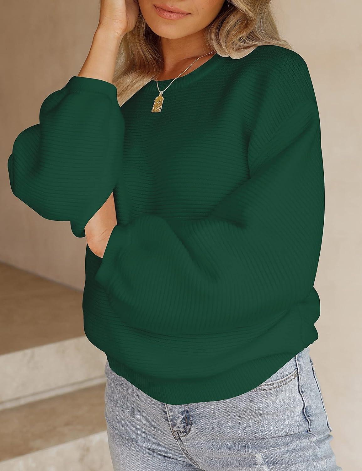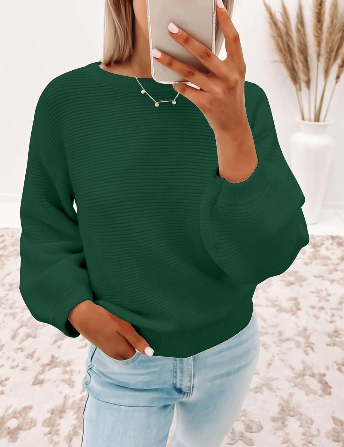 ZESICA Women’s Crew Neck Long Lantern Sleeve Fall 2025 Casual Loose Ribbed Knit Solid Soft Pullover Sweater Tops(Forestgreen)