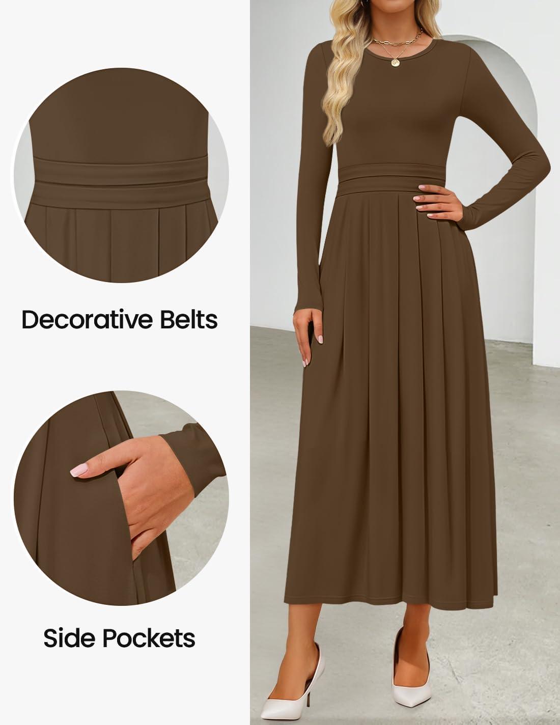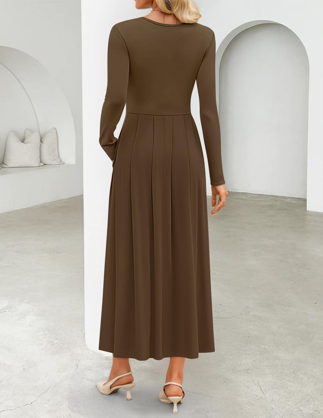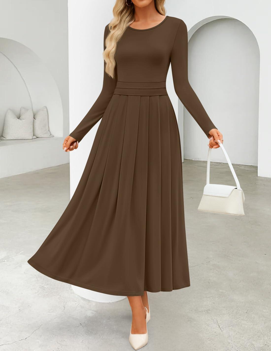 ZESICA Women’s Elegant Long Sleeve Maxi Dress 2025 Fall Crewneck Knit High Wasit Pleated Flowy A Line Casual Party Dresses(Brown)