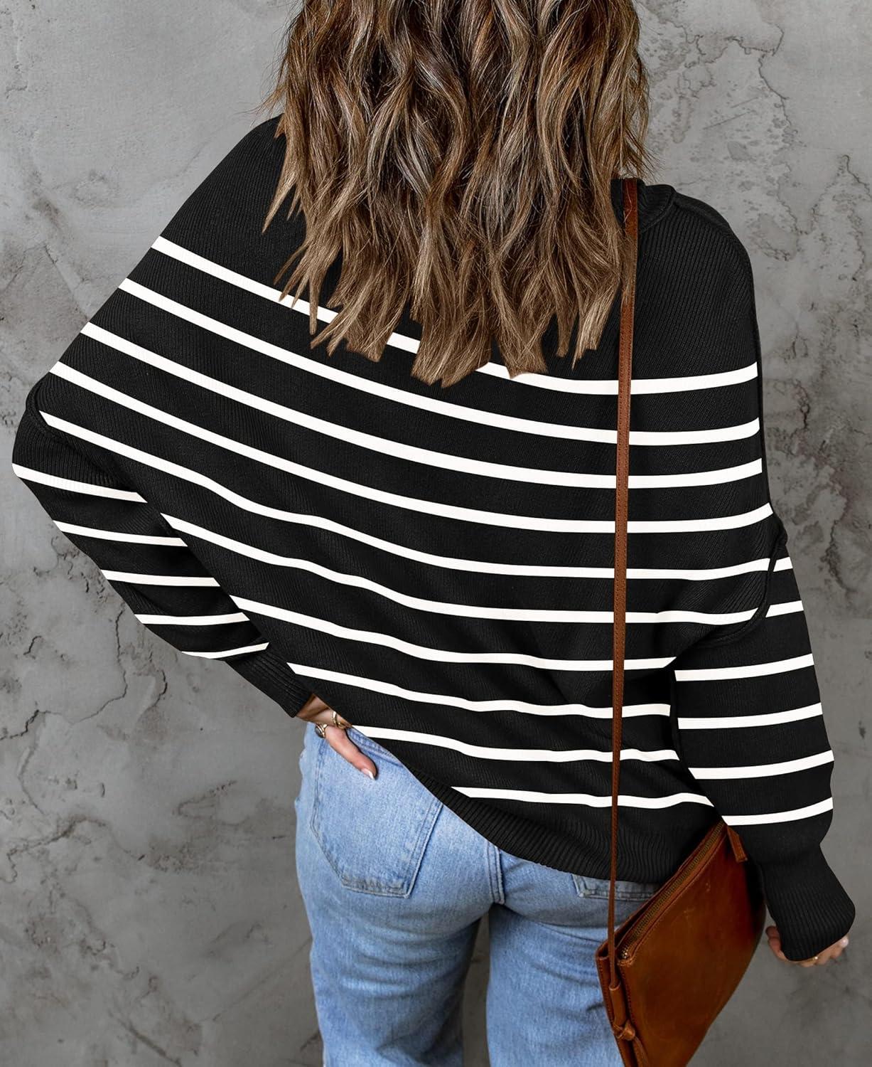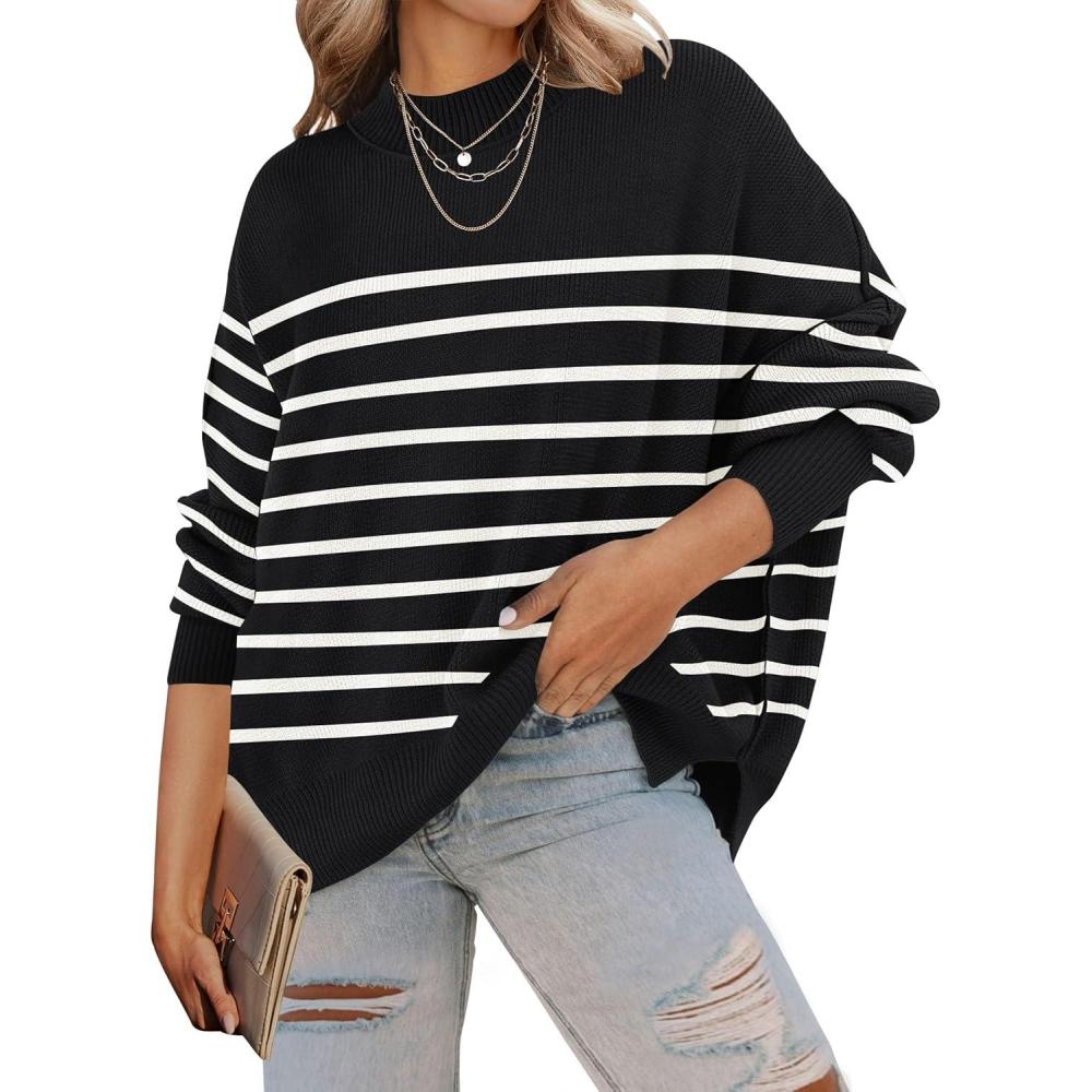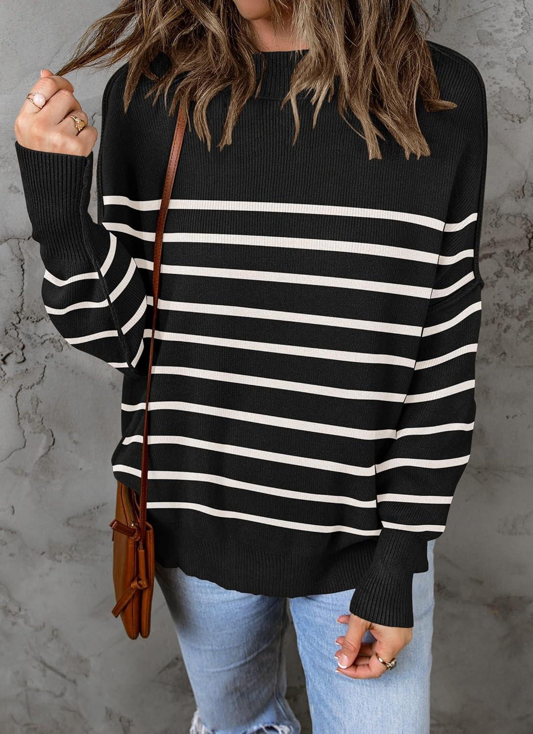 ZESICA Women's Fall 2025 Casual Long Sleeve Crew Neck Side Slit Oversized Ribbed Knit Pullover Sweater Tops(Blackstripe)
