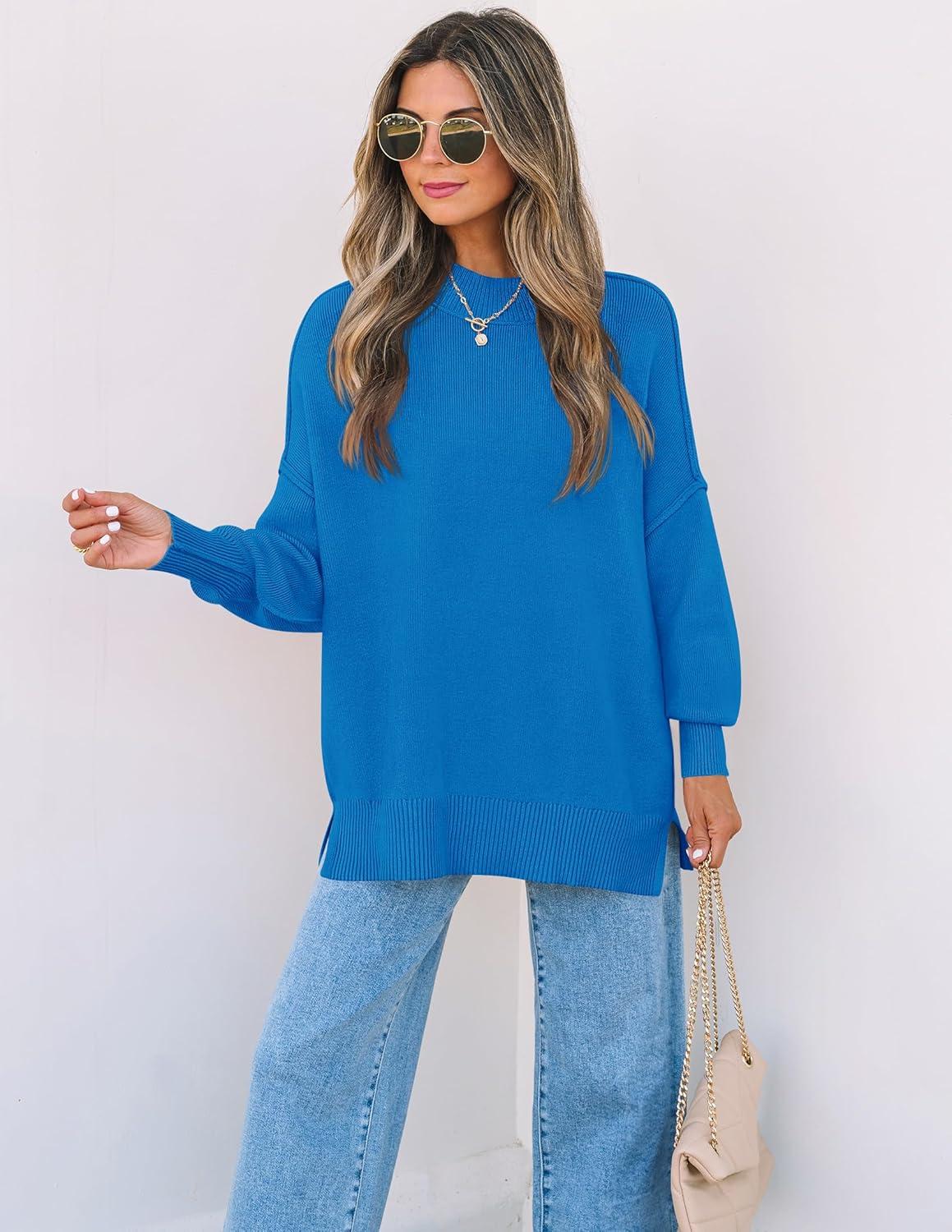 ZESICA Women's Fall 2025 Casual Long Sleeve Crew Neck Side Slit Oversized Ribbed Knit Pullover Sweater Tops(Brightblue)