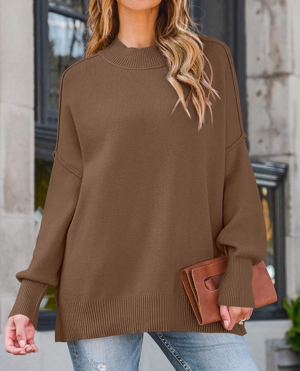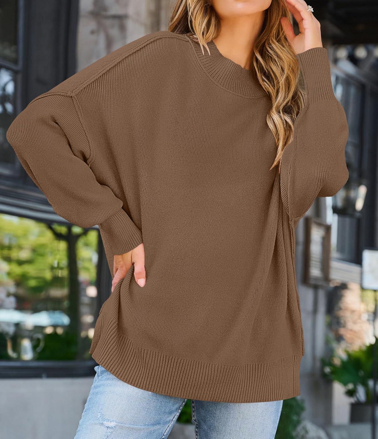 ZESICA Women’s Fall 2025 Casual Long Sleeve Crew Neck Side Slit Oversized Ribbed Knit Pullover Sweater Tops(Coffee)