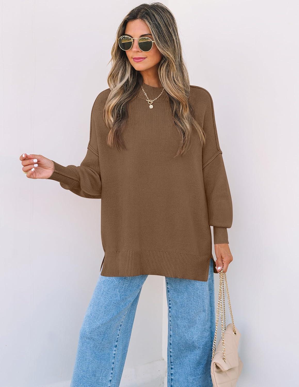 ZESICA Women's Fall 2025 Casual Long Sleeve Crew Neck Side Slit Oversized Ribbed Knit Pullover Sweater Tops(Coffee)