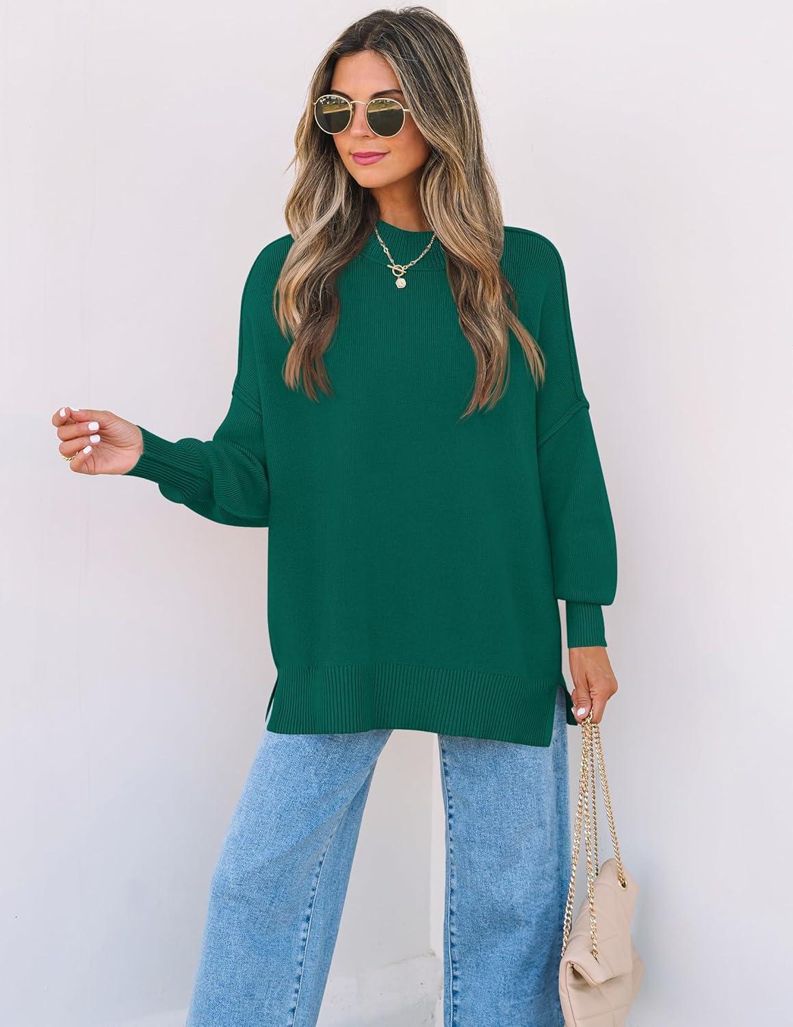 ZESICA Women's Fall 2025 Casual Long Sleeve Crew Neck Side Slit Oversized Ribbed Knit Pullover Sweater Tops(Forestgreen)