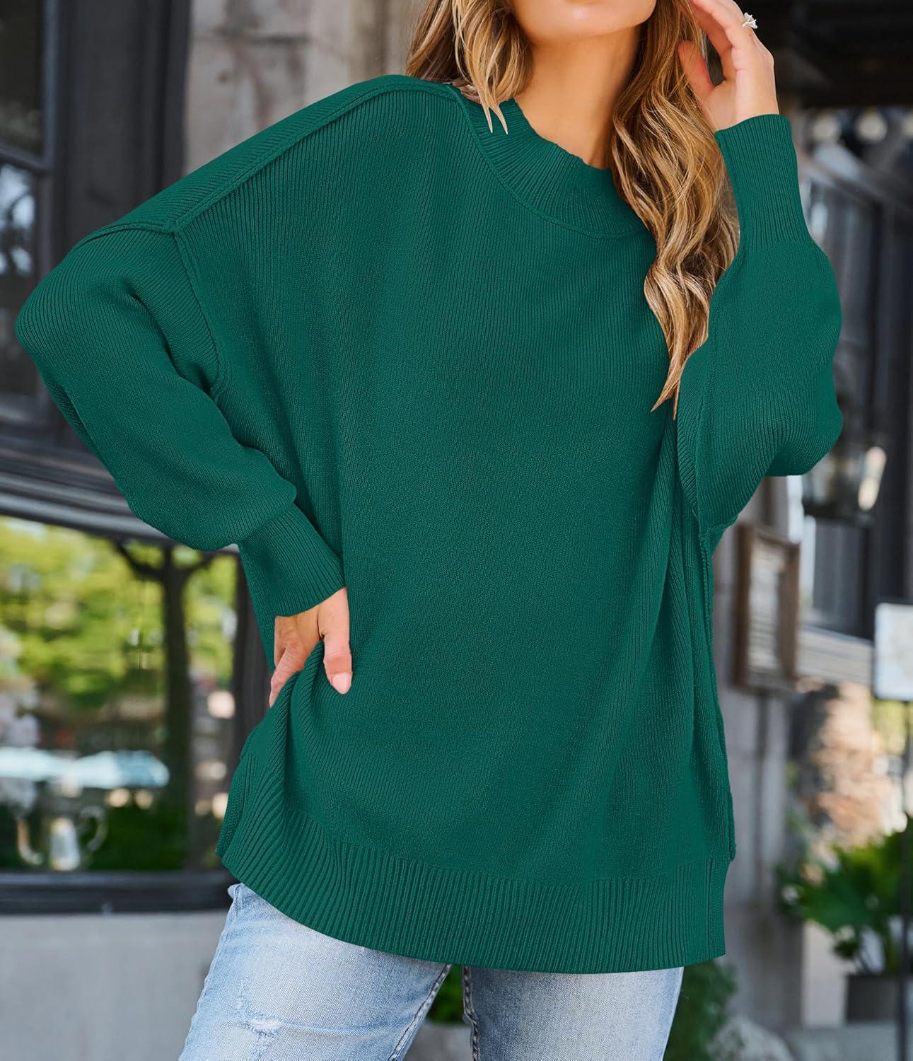 ZESICA Women’s Fall 2025 Casual Long Sleeve Crew Neck Side Slit Oversized Ribbed Knit Pullover Sweater Tops(Forestgreen)