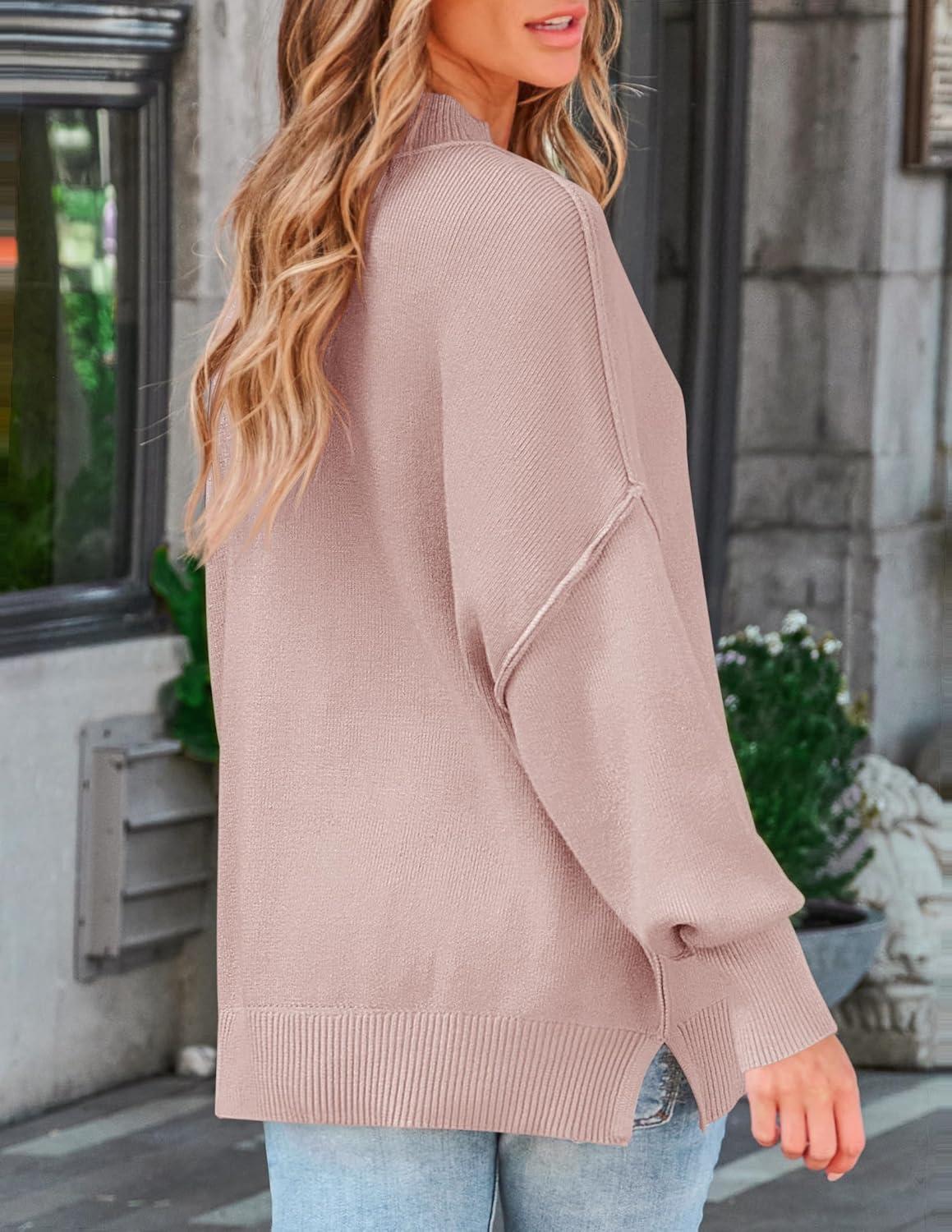 ZESICA Women’s Fall 2025 Casual Long Sleeve Crew Neck Side Slit Oversized Ribbed Knit Pullover Sweater Tops(Rose)
