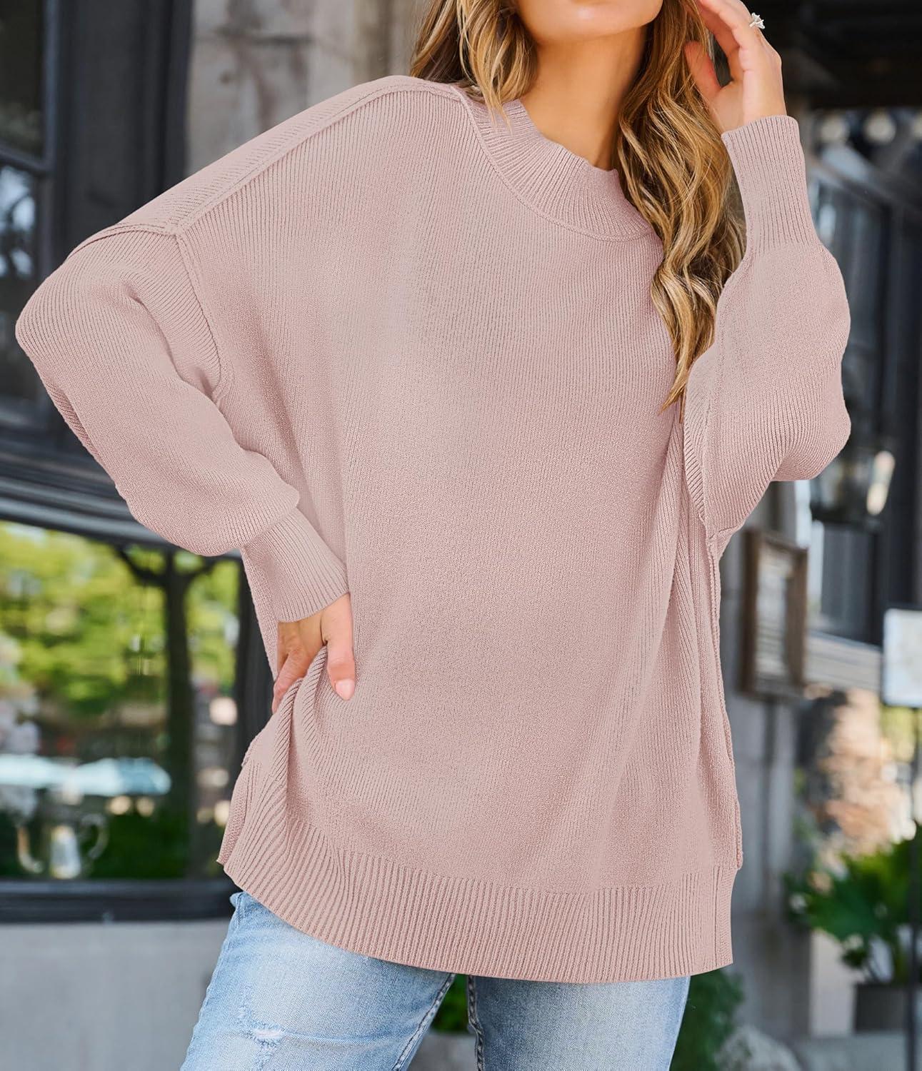 ZESICA Women’s Fall 2025 Casual Long Sleeve Crew Neck Side Slit Oversized Ribbed Knit Pullover Sweater Tops(Pink)