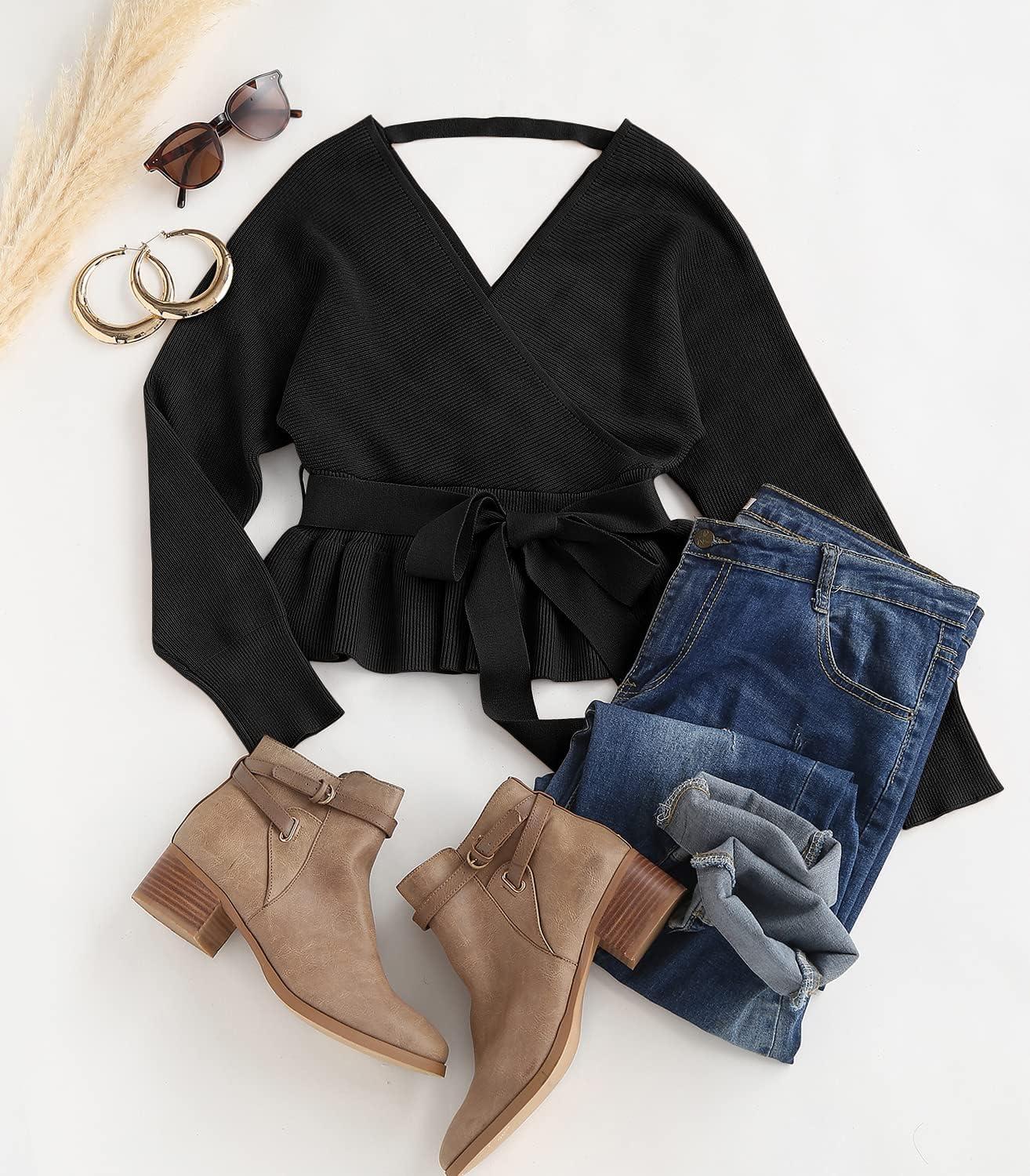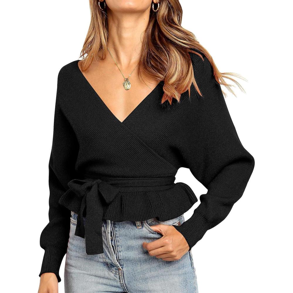 ZESICA Women’s Fall 2025 Wrap V Neck Long Batwing Sleeve Belted Waist Ruffle Knitted Sweater Pullover Top(Black)