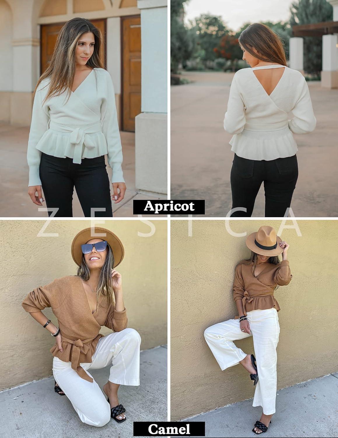 imageZESICA Womens Fall 2025 Wrap V Neck Long Batwing Sleeve Belted Waist Ruffle Knitted Sweater Pullover TopCamel
