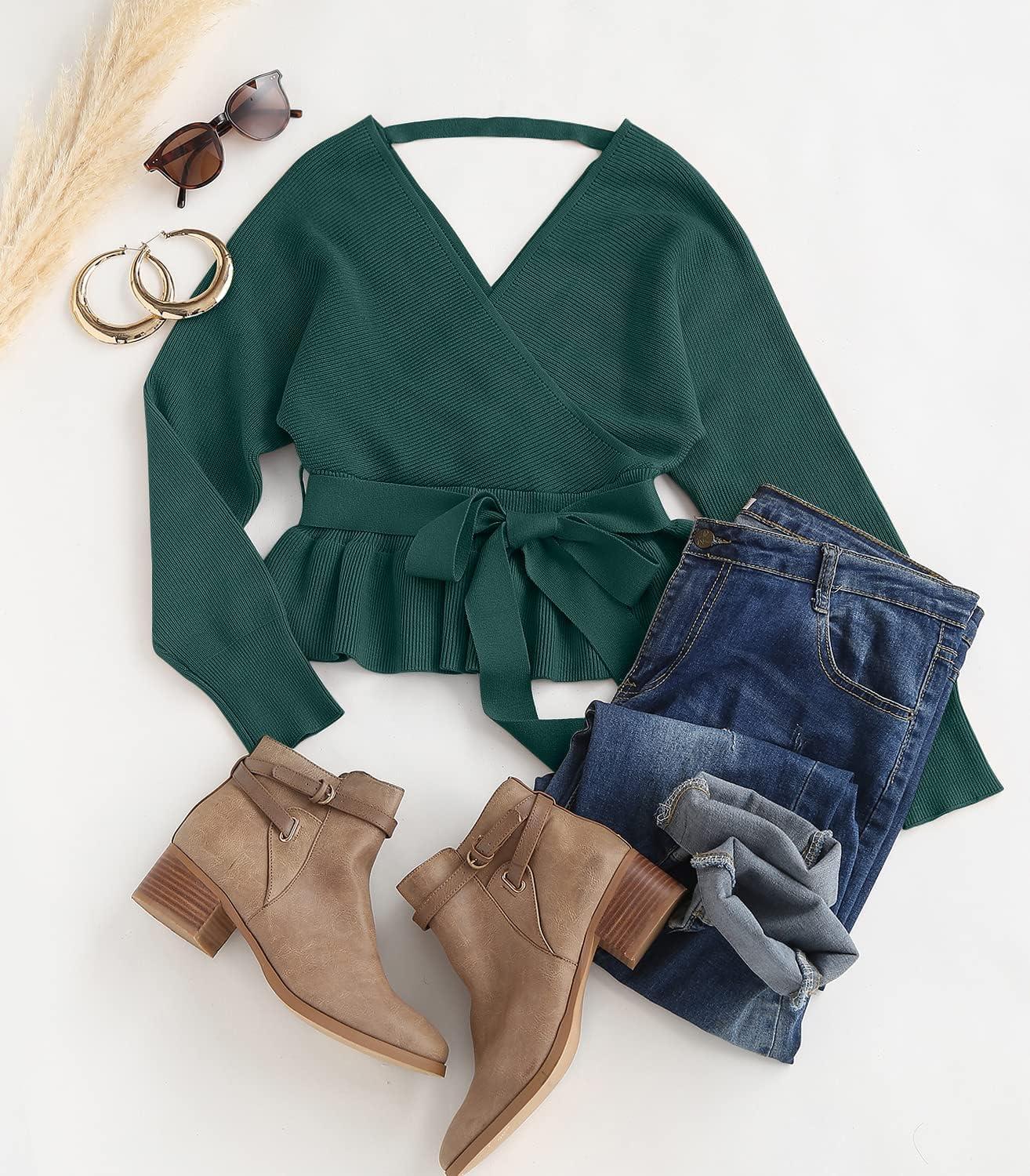 ZESICA Women’s Fall 2025 Wrap V Neck Long Batwing Sleeve Belted Waist Ruffle Knitted Sweater Pullover Top(Green)
