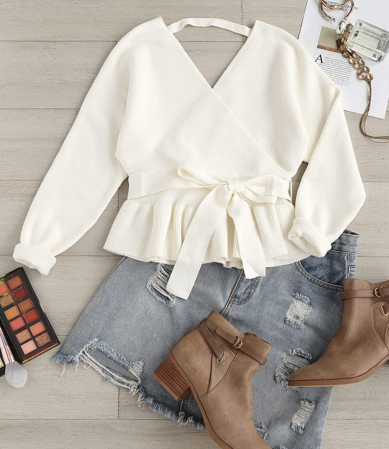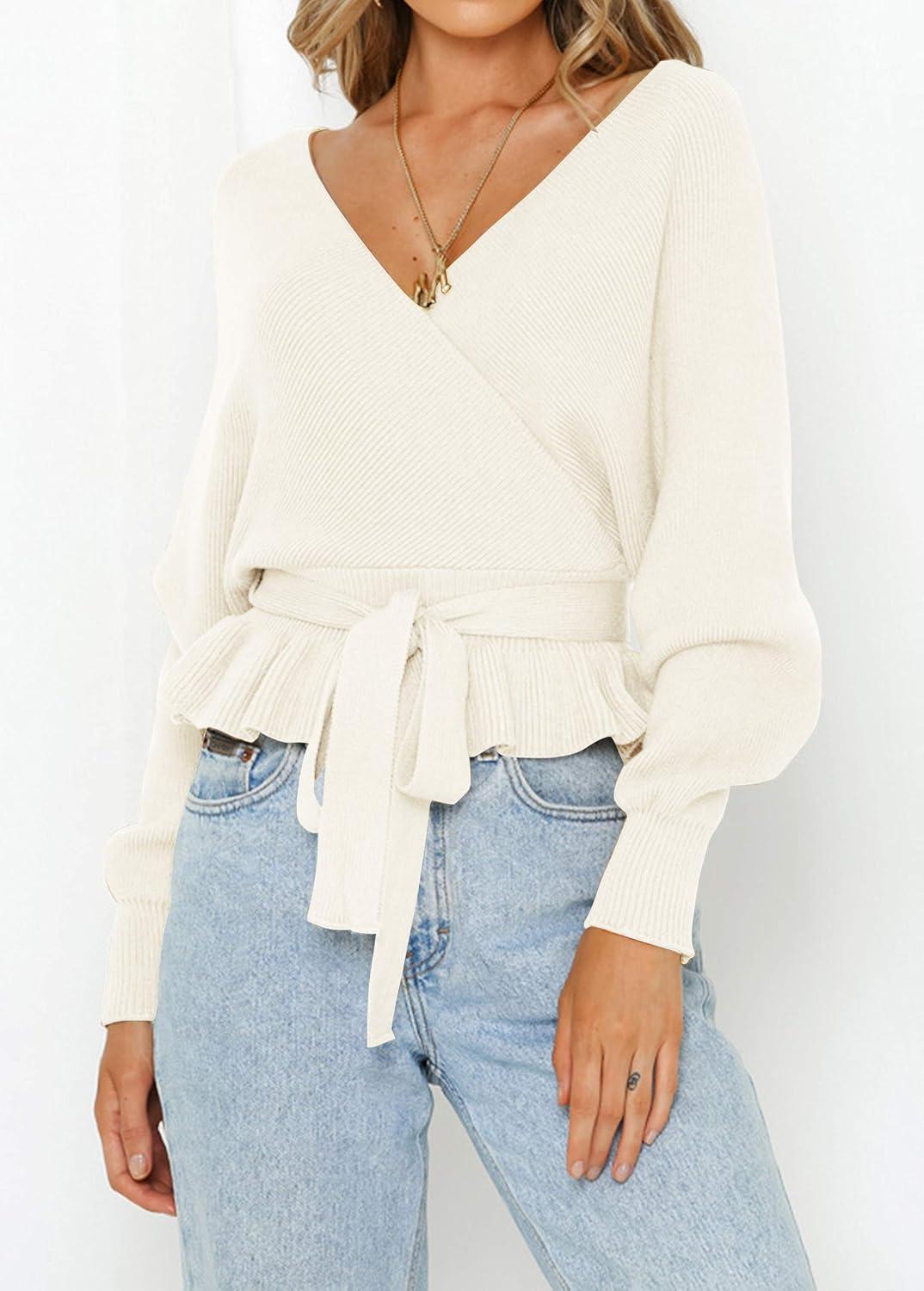ZESICA Women’s Fall 2025 Wrap V Neck Long Batwing Sleeve Belted Waist Ruffle Knitted Sweater Pullover Top(Ivory)
