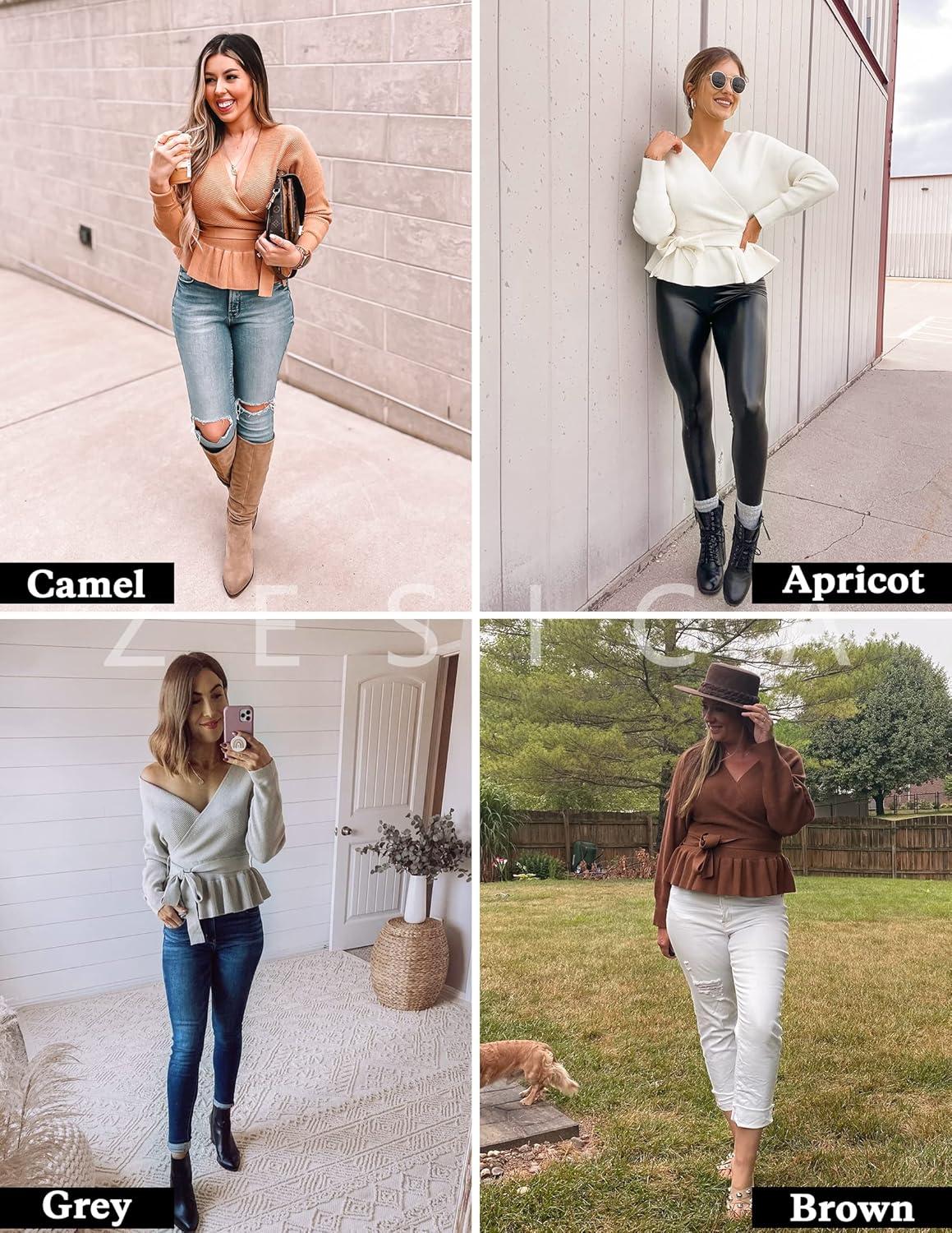 imageZESICA Womens Fall 2025 Wrap V Neck Long Batwing Sleeve Belted Waist Ruffle Knitted Sweater Pullover TopGrey
