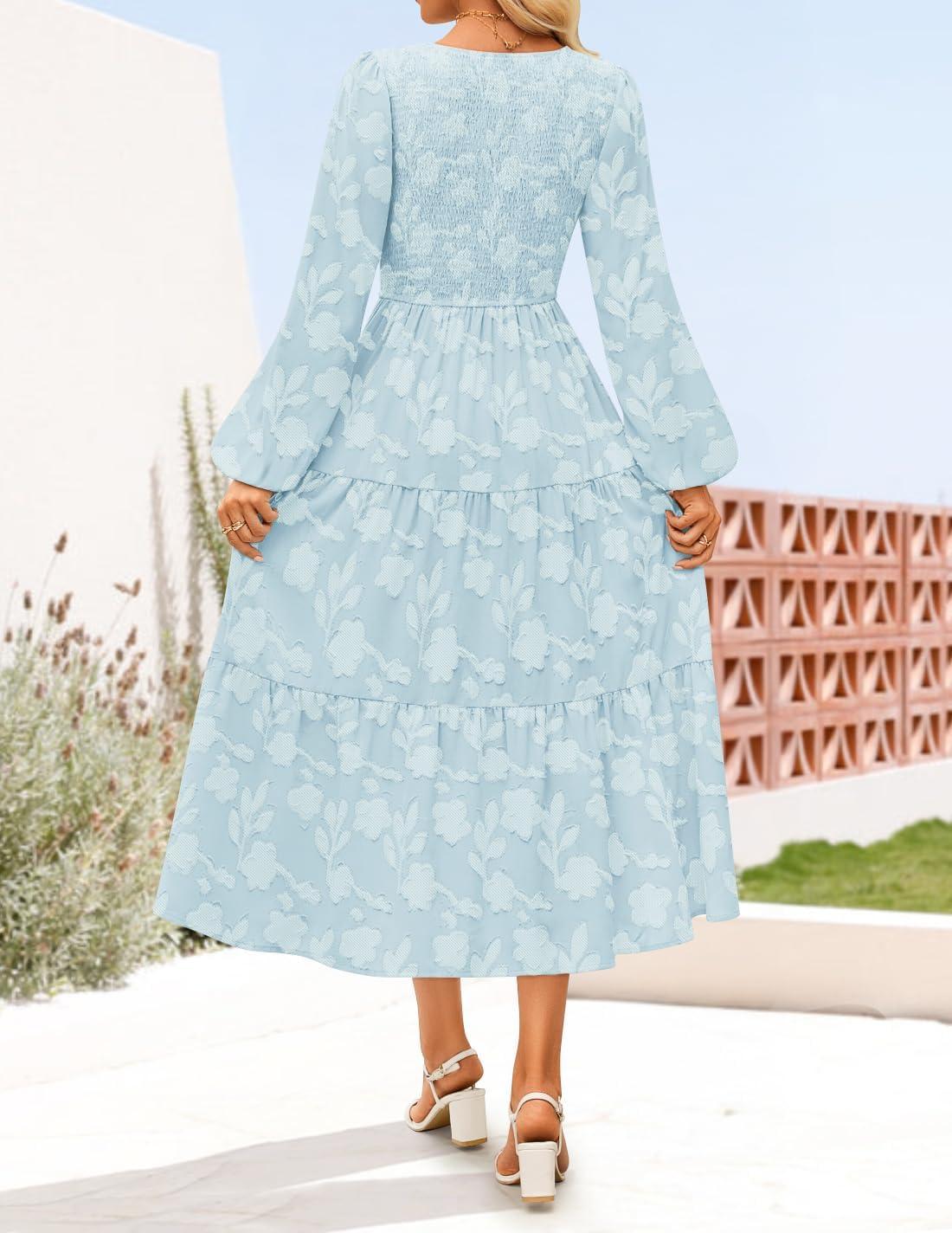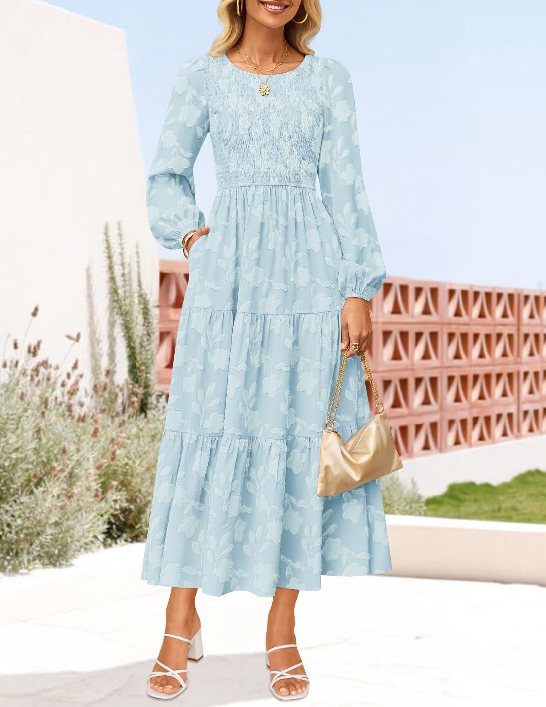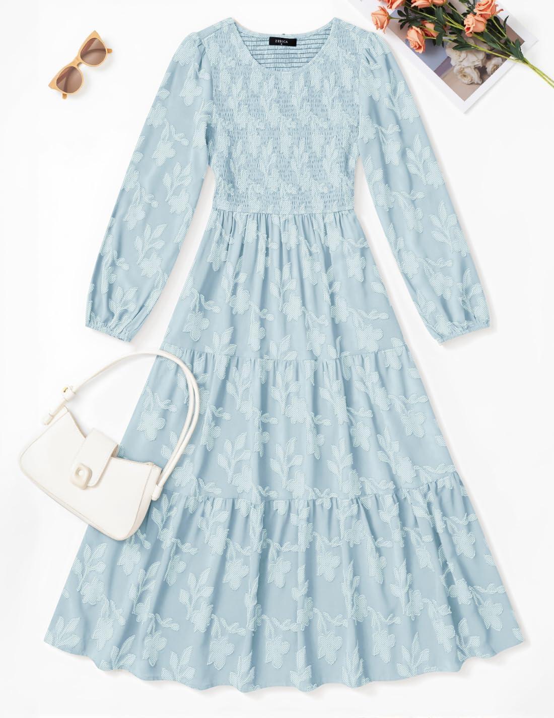 ZESICA Women’s Fall Boho Floral Midi Dress 2025 Casual Long Sleeve Crewneck Flowy Wedding Guest Long Dresses(Blue)