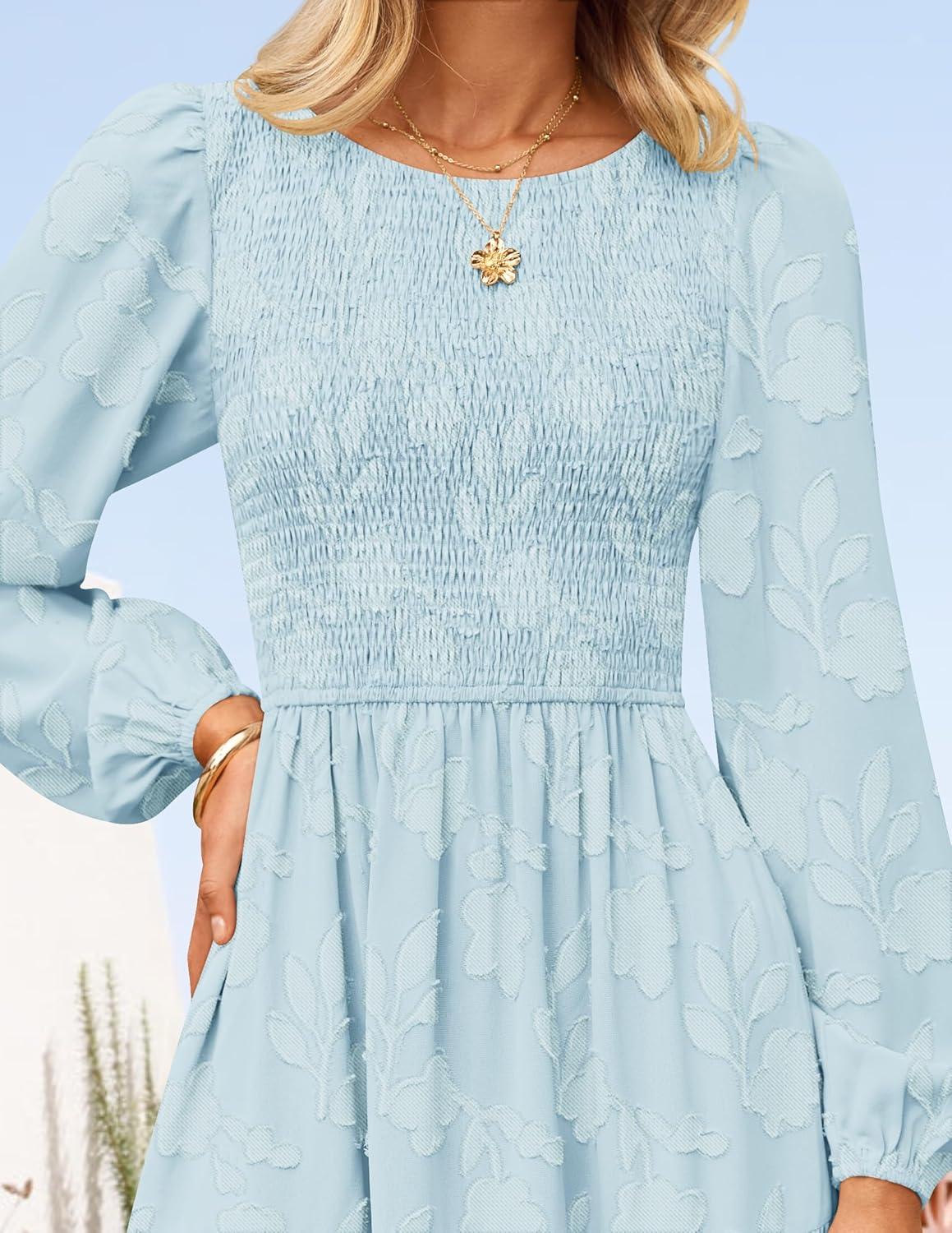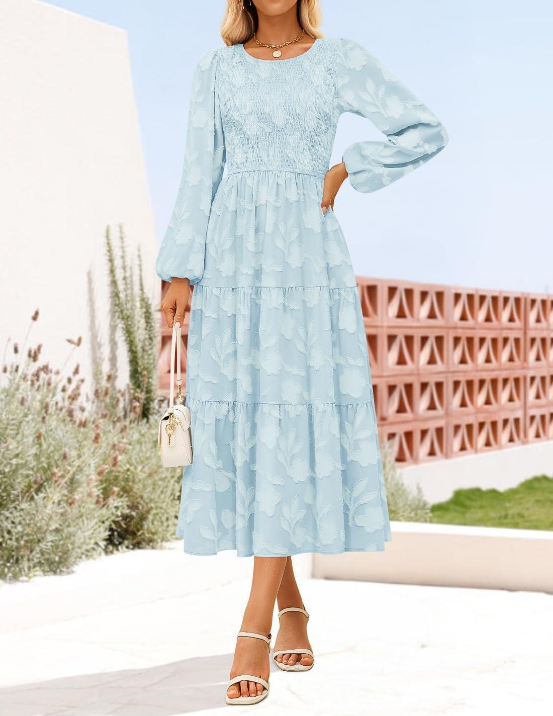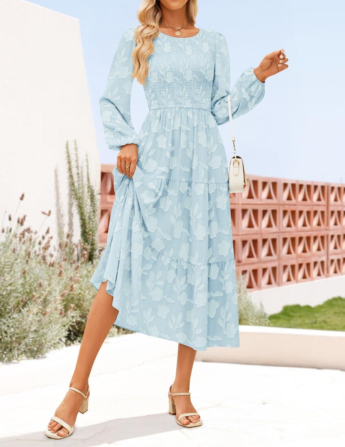 ZESICA Women’s Fall Boho Floral Midi Dress 2025 Casual Long Sleeve Crewneck Flowy Wedding Guest Long Dresses(Blue)