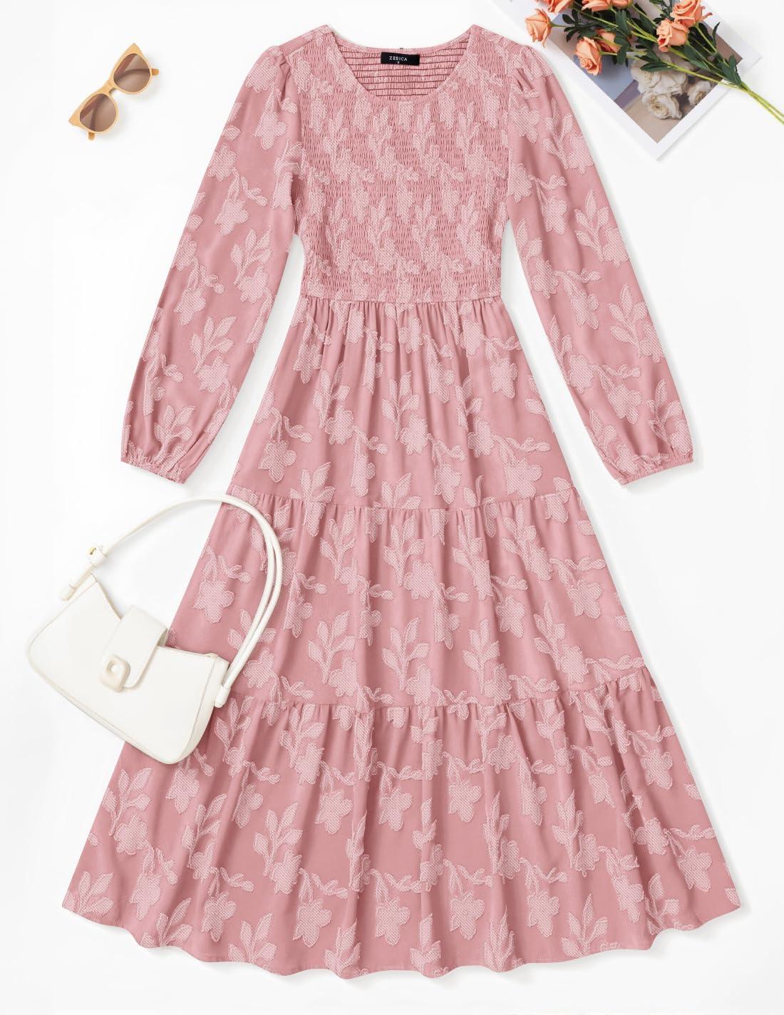 ZESICA Women’s Fall Boho Floral Midi Dress 2025 Casual Long Sleeve Crewneck Flowy Wedding Guest Long Dresses(Pink)