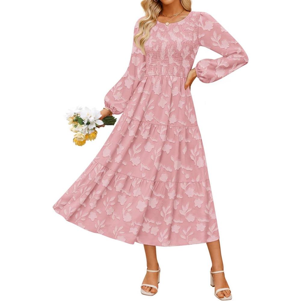 ZESICA Women's Fall Boho Floral Midi Dress 2025 Casual Long Sleeve Crewneck Flowy Wedding Guest Long Dresses(Pink)