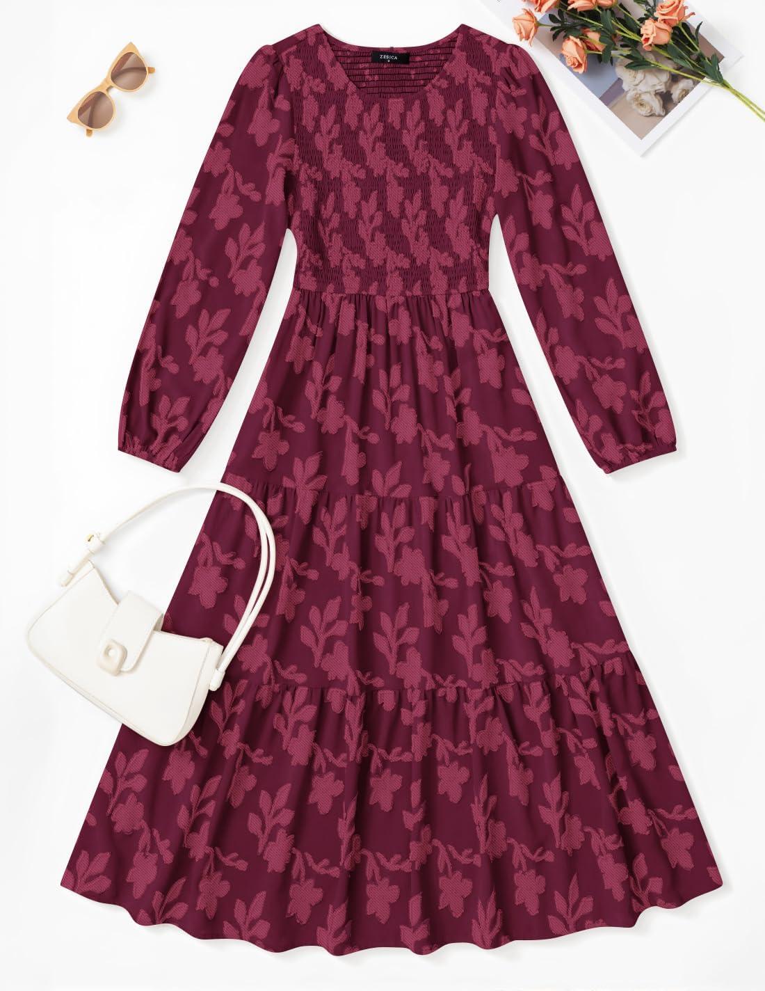 ZESICA Women’s Fall Boho Floral Midi Dress 2025 Casual Long Sleeve Crewneck Flowy Wedding Guest Long Dresses(Wine)
