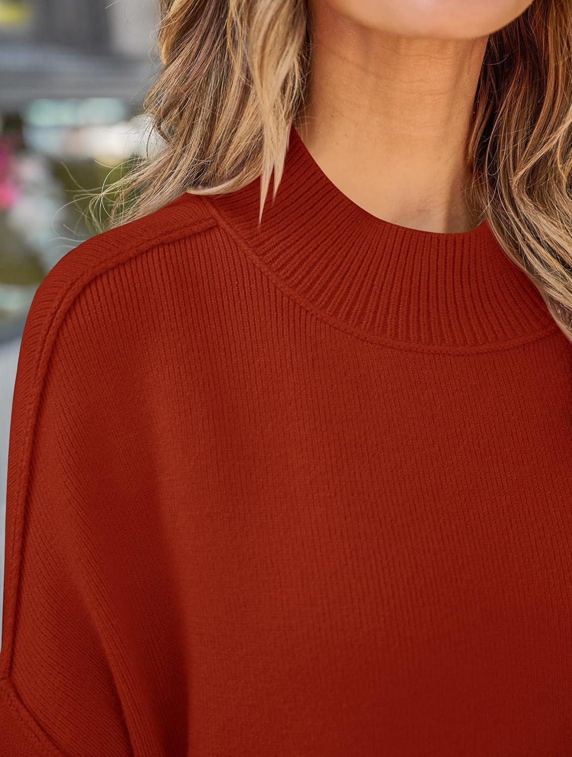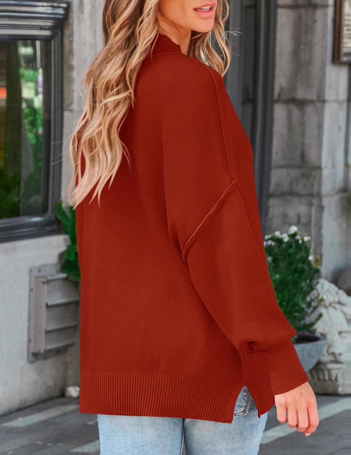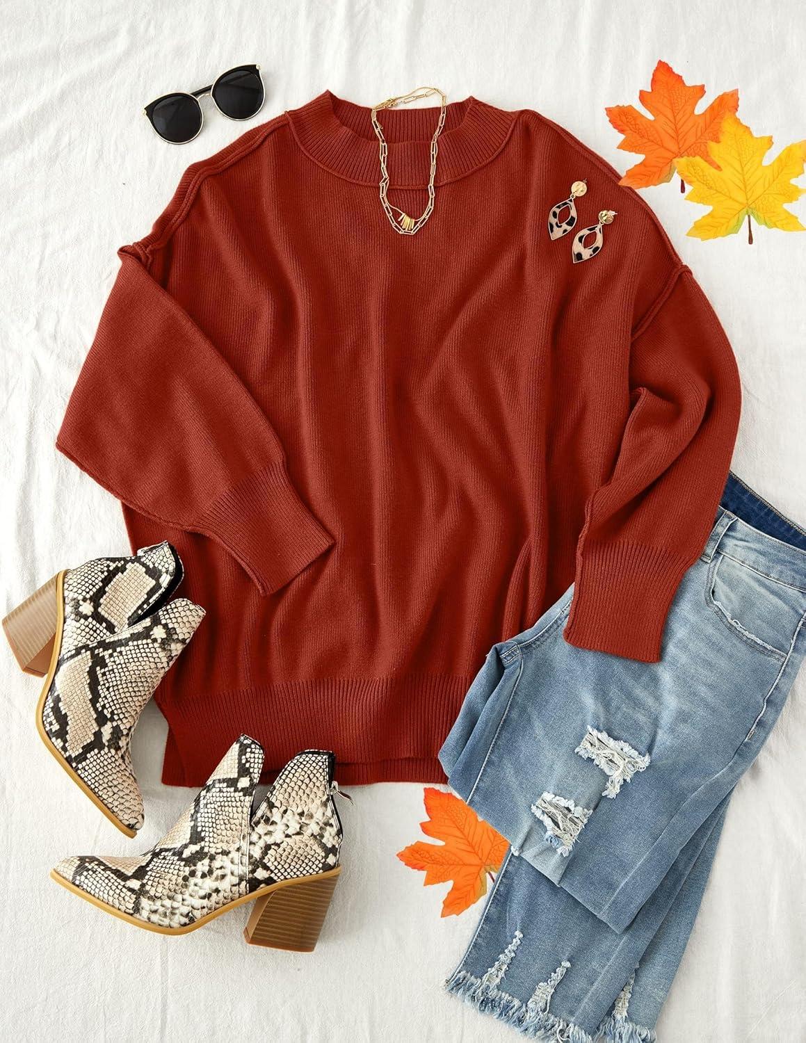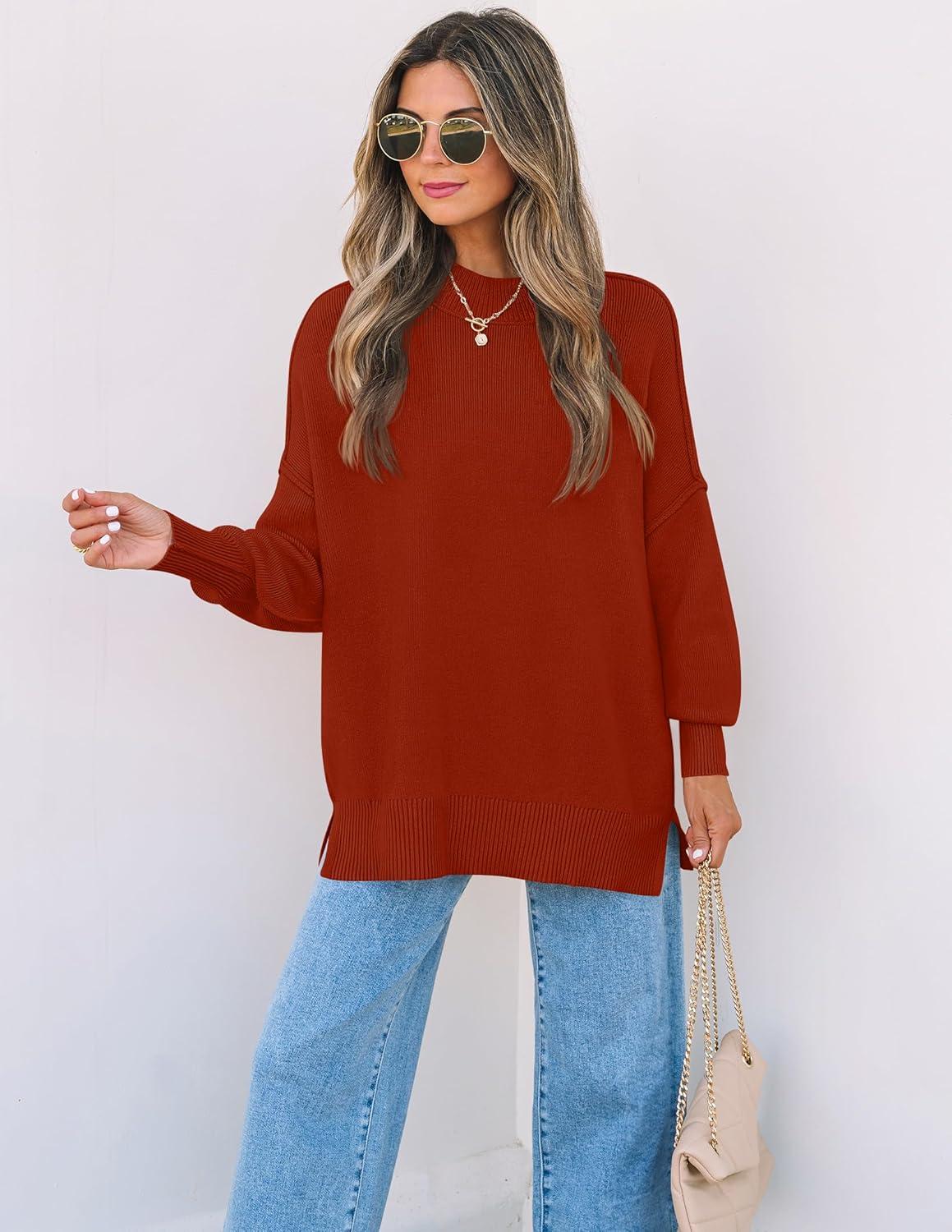 ZESICA Women’s Fall Casual Long Sleeve Crew Neck Side Slit Oversized Ribbed Knit Pullover Sweater Tops(Rust)