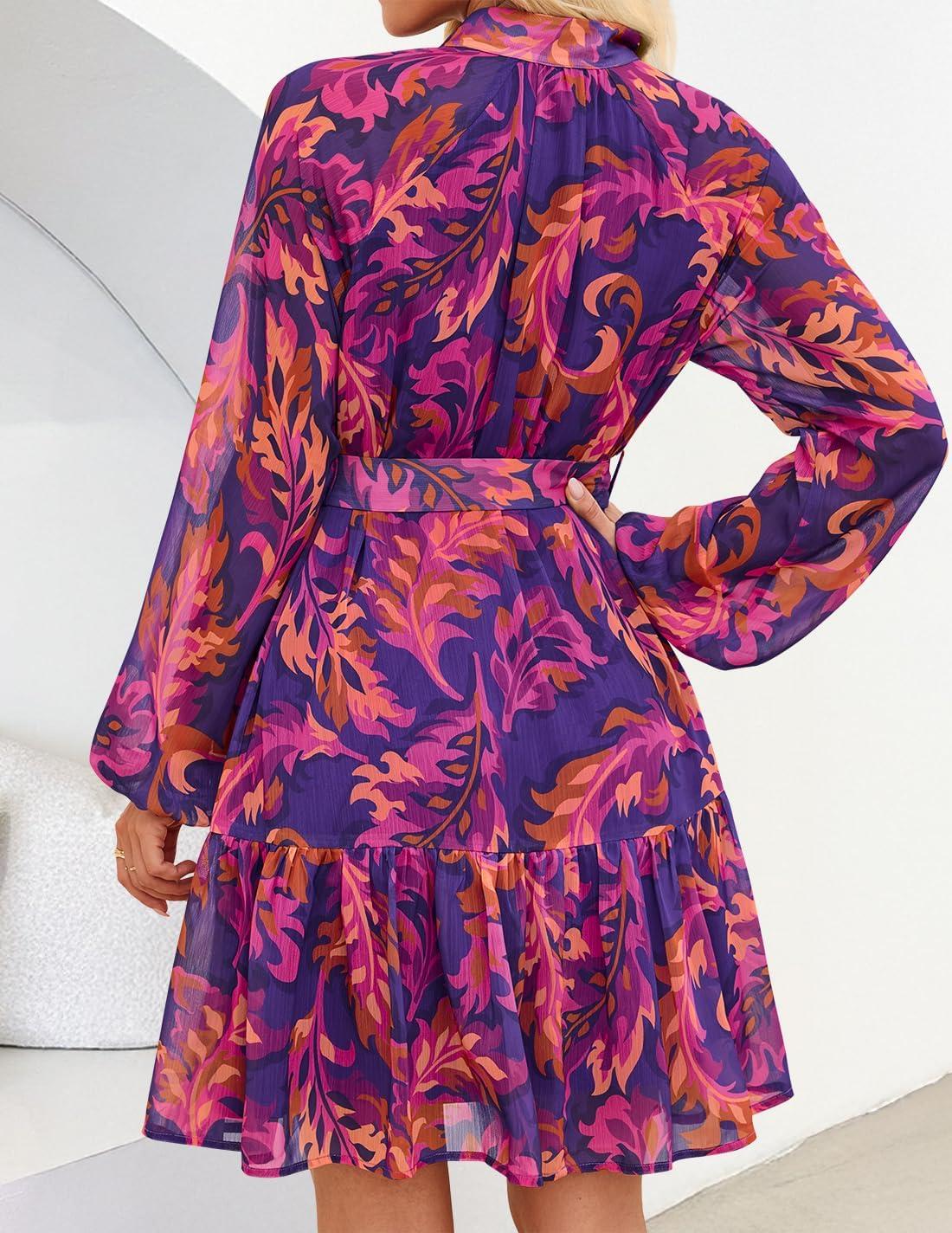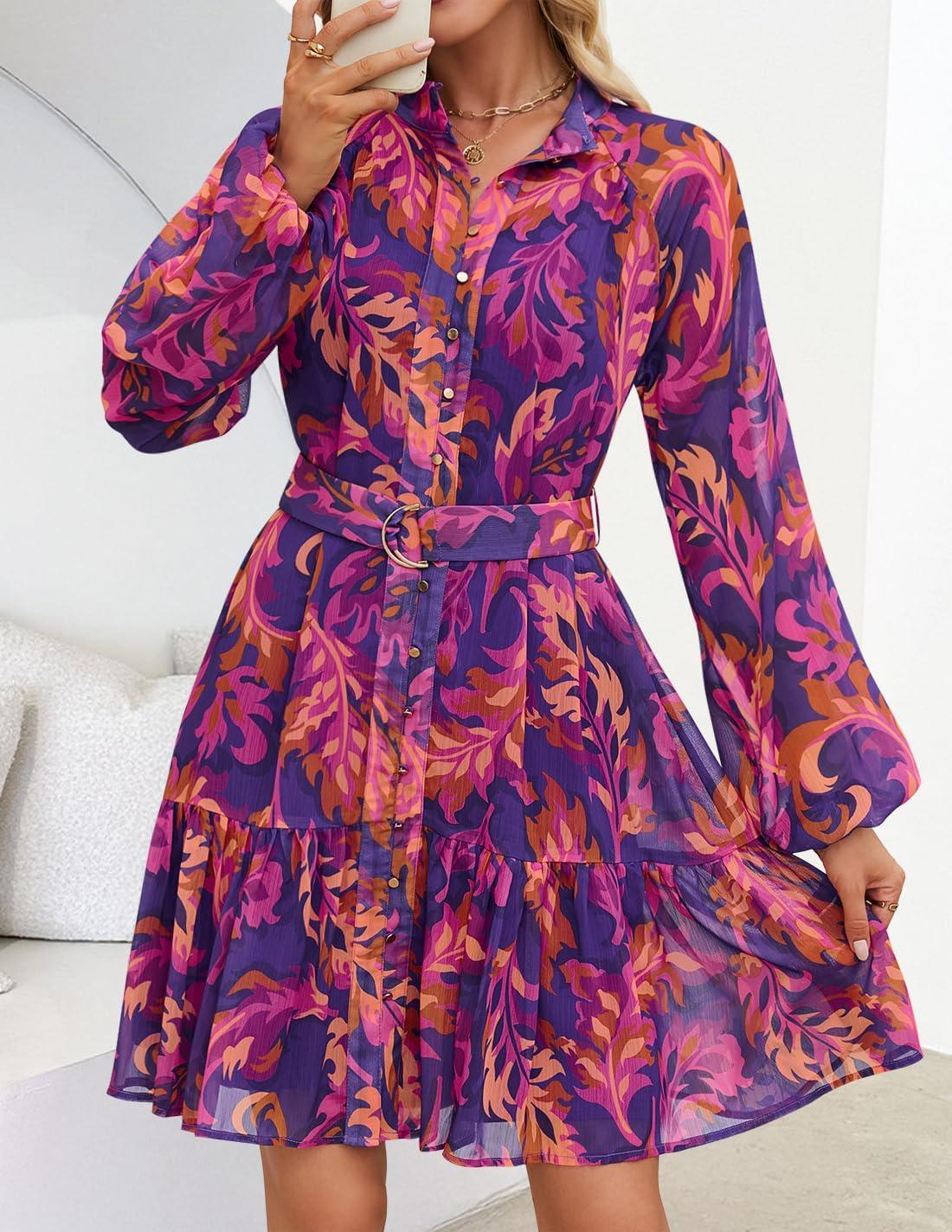 ZESICA Womens Fall Floral Mini Dress 2025 Boho Long Sleeve Button Chiffon A Line Short Vacation Party Dresses with Belt(Purple)