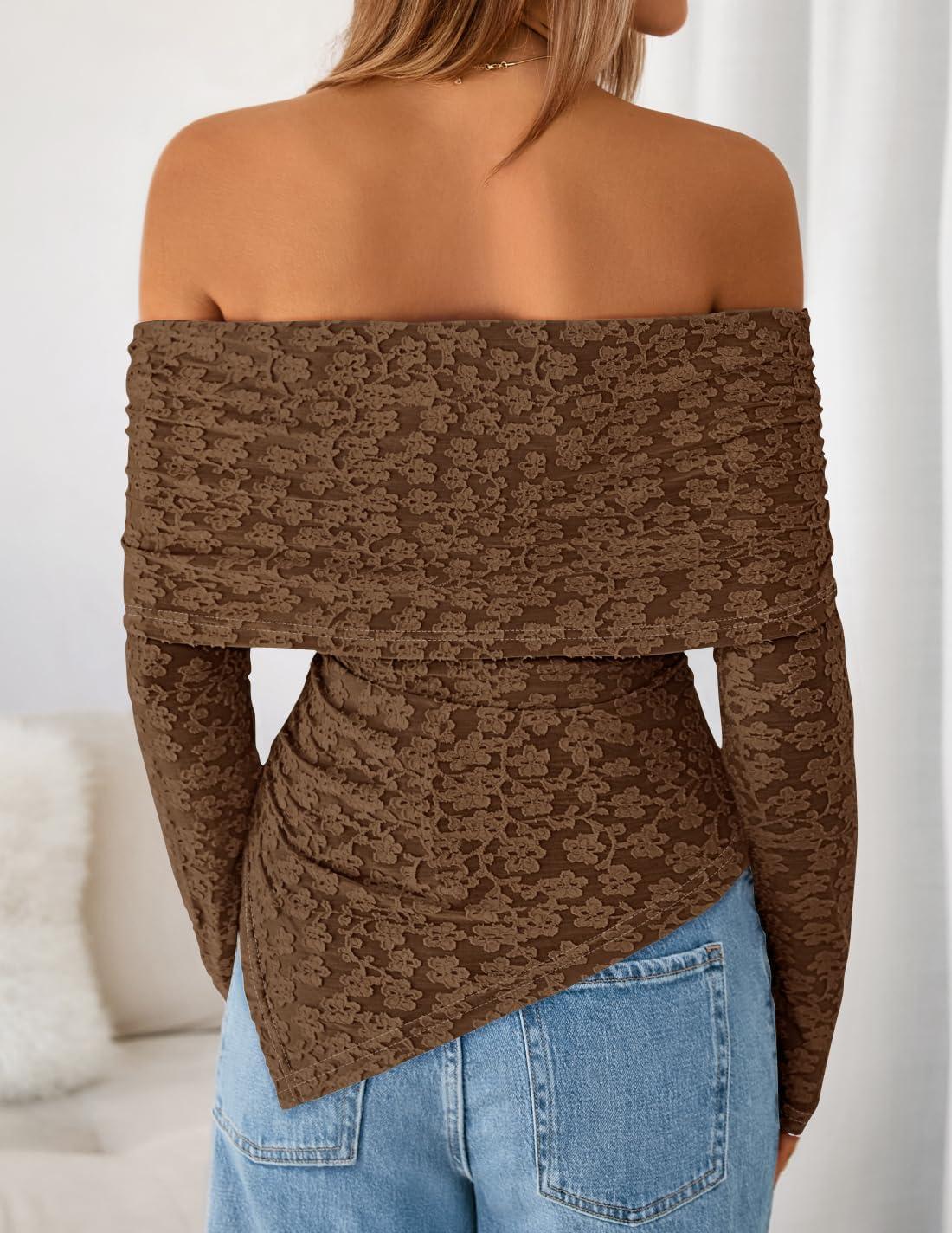 ZESICA Women’s Fall Floral Off Shoulder Tops 2025 Mesh Long Sleeve Shirts Asymmetrical Ruched Tee Blouses Trendy Outfits(Coffee)