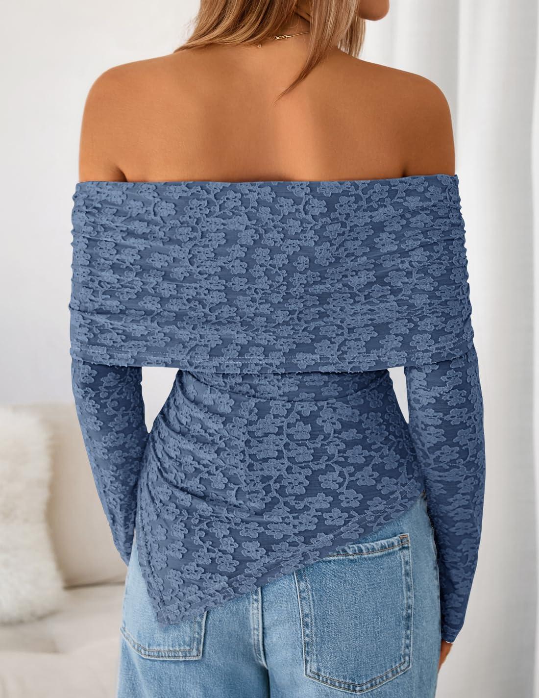 ZESICA Women’s Fall Floral Off Shoulder Tops 2025 Mesh Long Sleeve Shirts Asymmetrical Ruched Tee Blouses Trendy Outfits(Dustyblue)