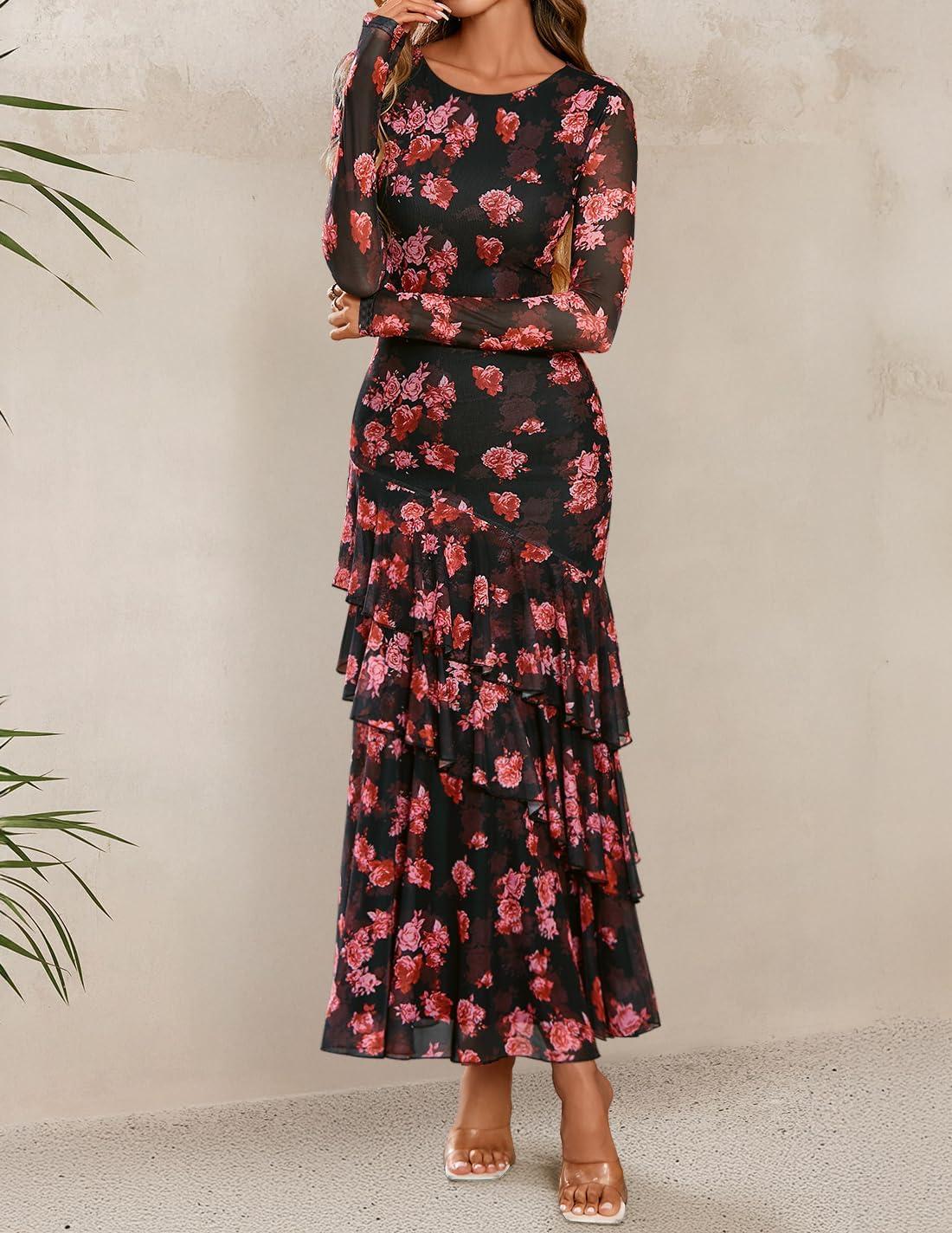 ZESICA Women’s Fall Floral Wedding Guest Bodycon Dresses 2025 Long Sleeve Crewneck Mesh Ruffle Mermaid Party Maxi Dress(Black)